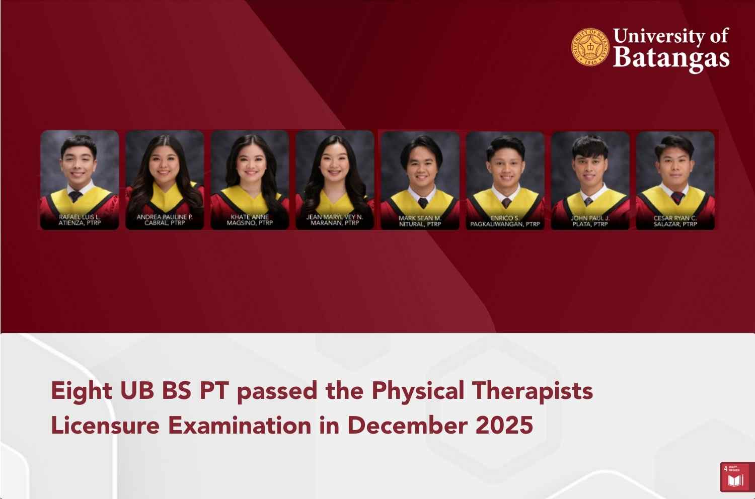 The University of Batangas (UB) proudly announces the success of its Bachelor of Science in Physical Therapy (BS PT) graduates in the December 2025 Physical Therapists Licensure Examination (PTLE), held on December 10, 2025.