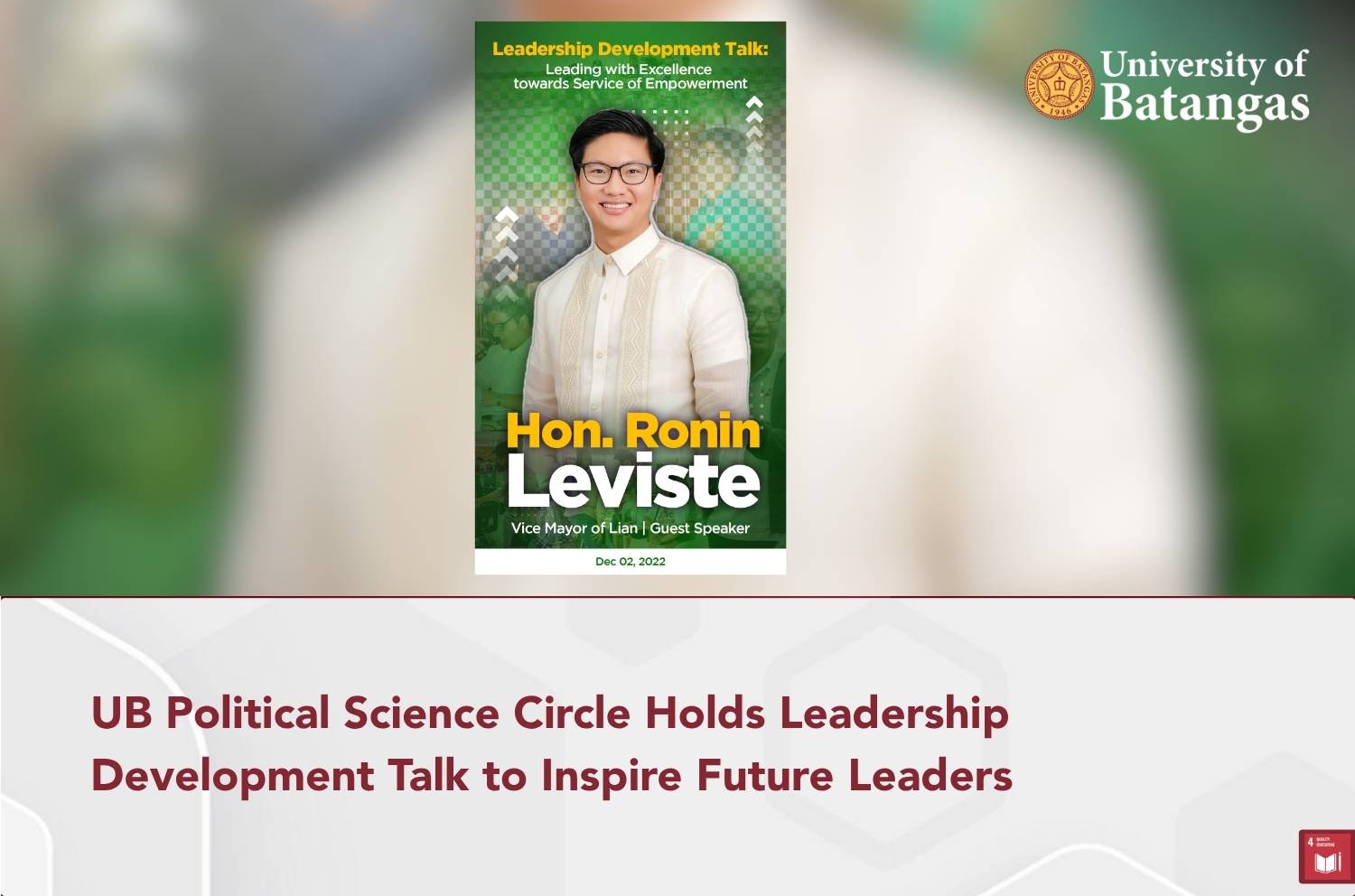 The University of Batangas (UB) Political Science Circle (PSC) held the Leadership Development Assembly: Development Talk in 2022, providing students with a unique opportunity to engage with young yet experienced political leaders. The event, hosted on the university campus, aimed to foster leadership excellence and political awareness among Political Science students.
