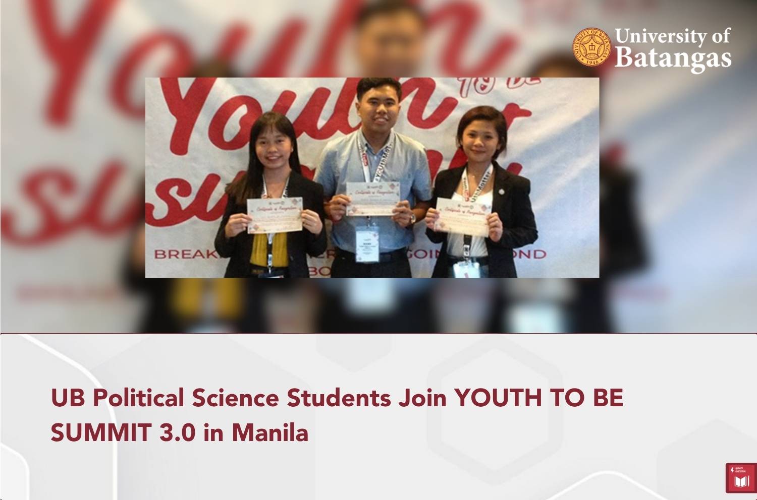 Three students from the University of Batangas (UB) Political Science Circle (PSC) participated in the YOUTH TO BE SUMMIT 3.0 on February 1, 2020, at the Benavides Auditorium, University of Santo Tomas. The summit carried the theme “Breaking the Barriers and Going Beyond Borders.”