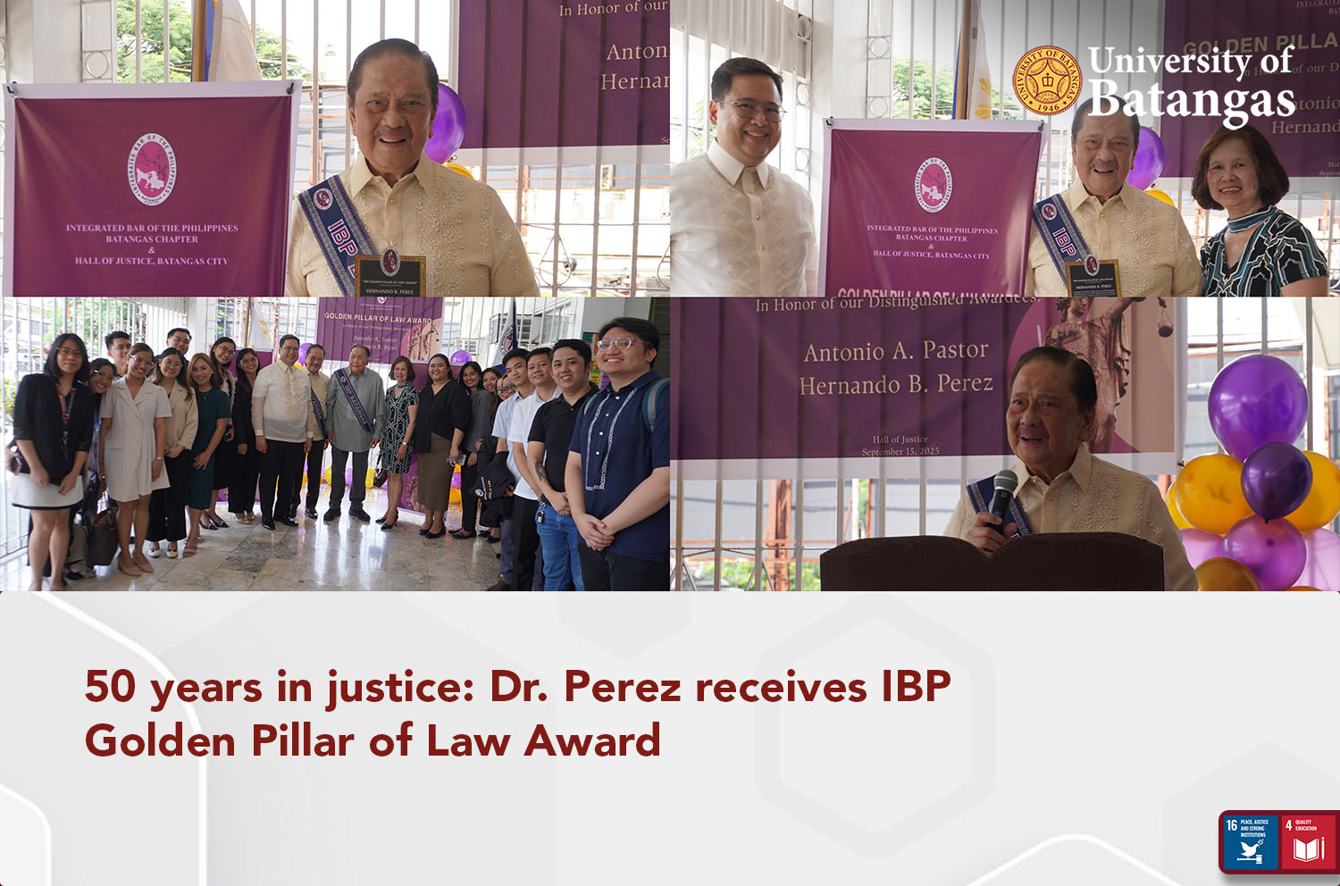 Dr. Hernando B. Perez, President Emeritus and member of the Board of Regents of the University of Batangas (UB), celebrated 50 years of service in the legal profession and received the Golden Pillar of Law Award from the Integrated Bar of the Philippines (IBP) during a ceremony at the Hall of Justice, Batangas City, on September 15, 2025.