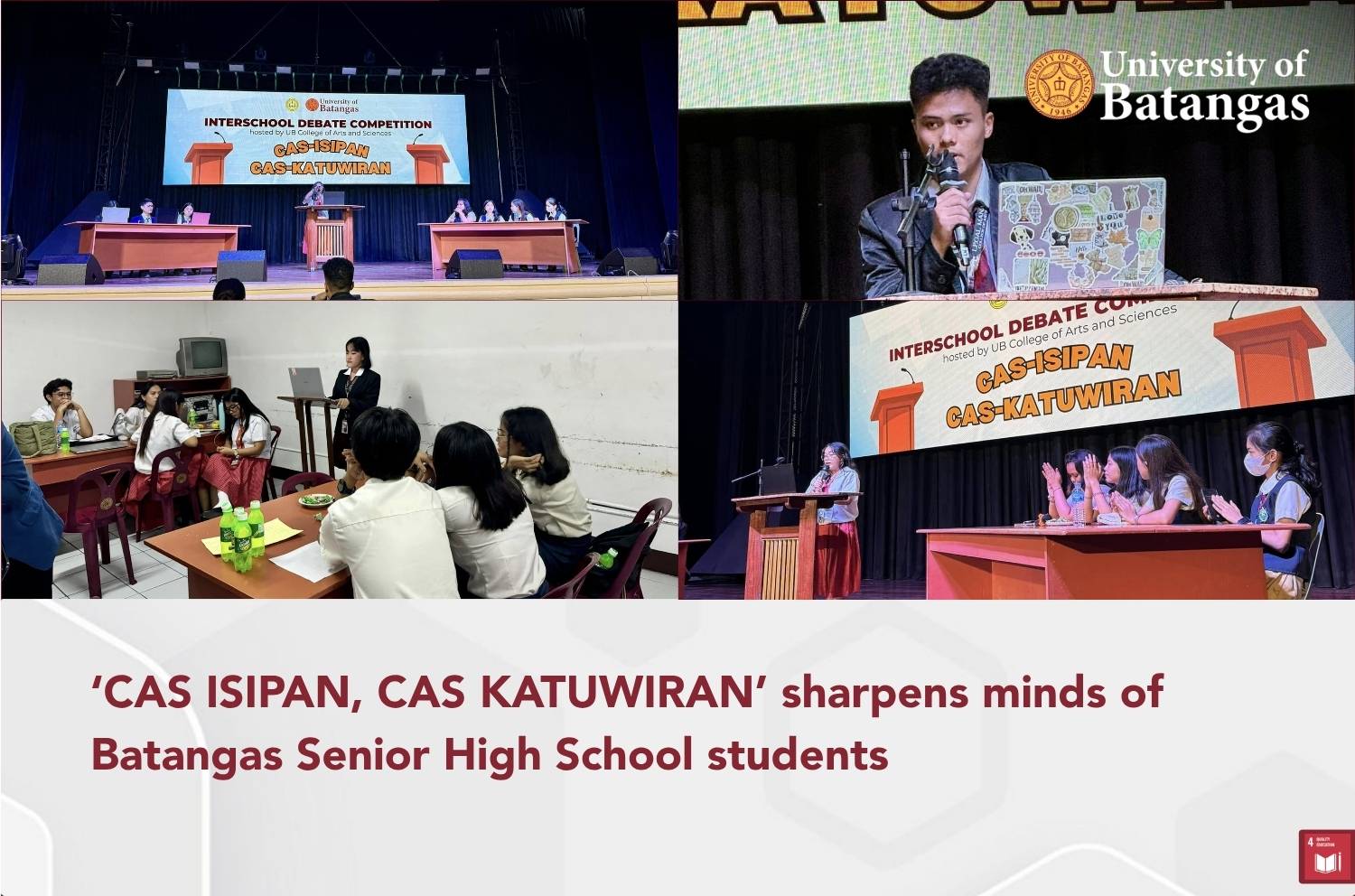 The University of Batangas (UB) College of Arts and Sciences (CAS) and senior high school students from various schools across Batangas Province demonstrated their debating and critical thinking skills during “CAS ISIPAN, CAS KATUWIRAN” on May 2, 2024.