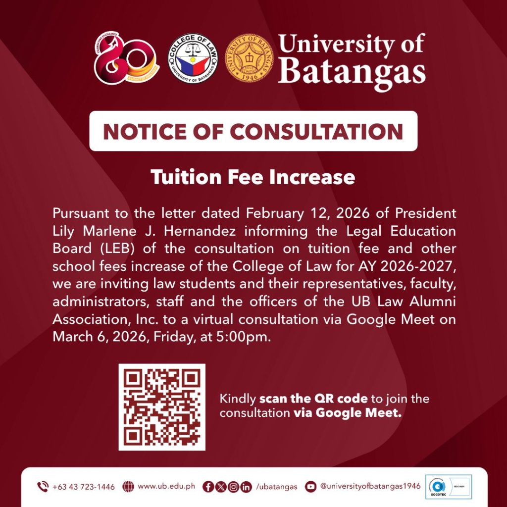 The UB College of Law is the first law school in the province of Batangas established in 1949. The opening of the College of Law was a commitment of the institution’s founders to give access to affordable quality legal education to students who do not have the means to pursue a law degree in Manila and realize their dreams of becoming members of the legal profession. From 1949 to 1979, the College of Law produced lawyers who have distinguished themselves in different areas of law. The College closed down in 1979, but re-opened in 1993 sharing the core vision of the University of Batangas “to be a center of excellence committed to serve the broader community through quality education” Government Recognition for the degree Bachelor of Laws was granted by the Commission on Higher Education on April 11, 1997. To the working professionals in the province of Batangas who would not otherwise have the opportunity to obtain a law degree in Manila, the re-opening of UB Law was a step towards the realization of their dreams.