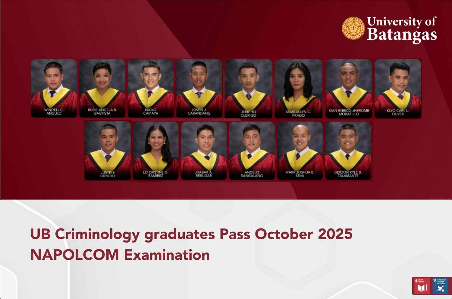 The University of Batangas (UB) recorded another milestone as graduates from its Bachelor of Science in Criminology (BS Crim) program passed the October 2025 National Police Commission (NAPOLCOM) Examination, with