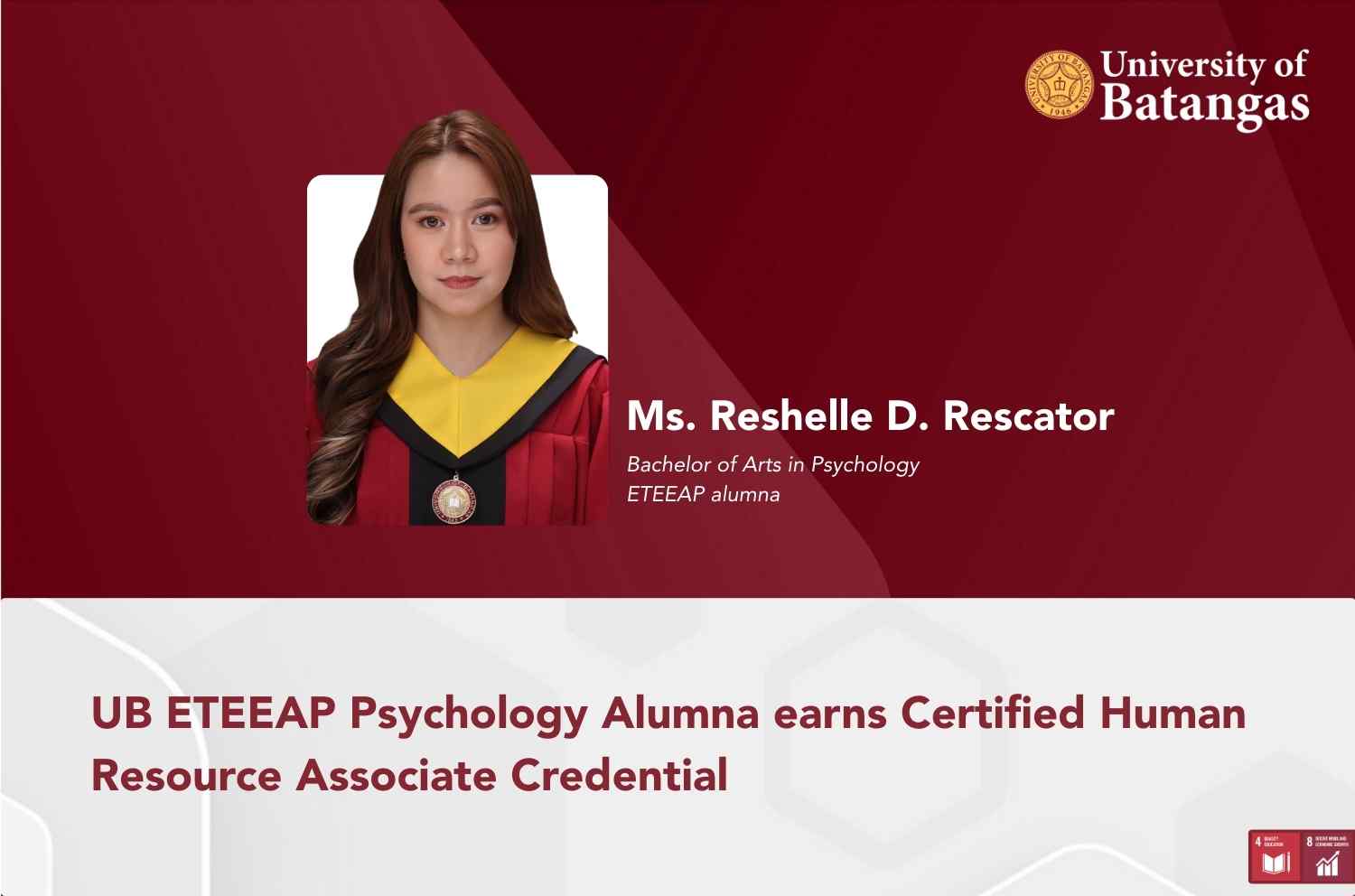 Reshelle D. Rescator, an alumna of the University of Batangas (UB) Expanded Tertiary Education Equivalency and Accreditation Program (ETEEAP) under the Bachelor of Arts in Psychology (AB Psych), earned the
