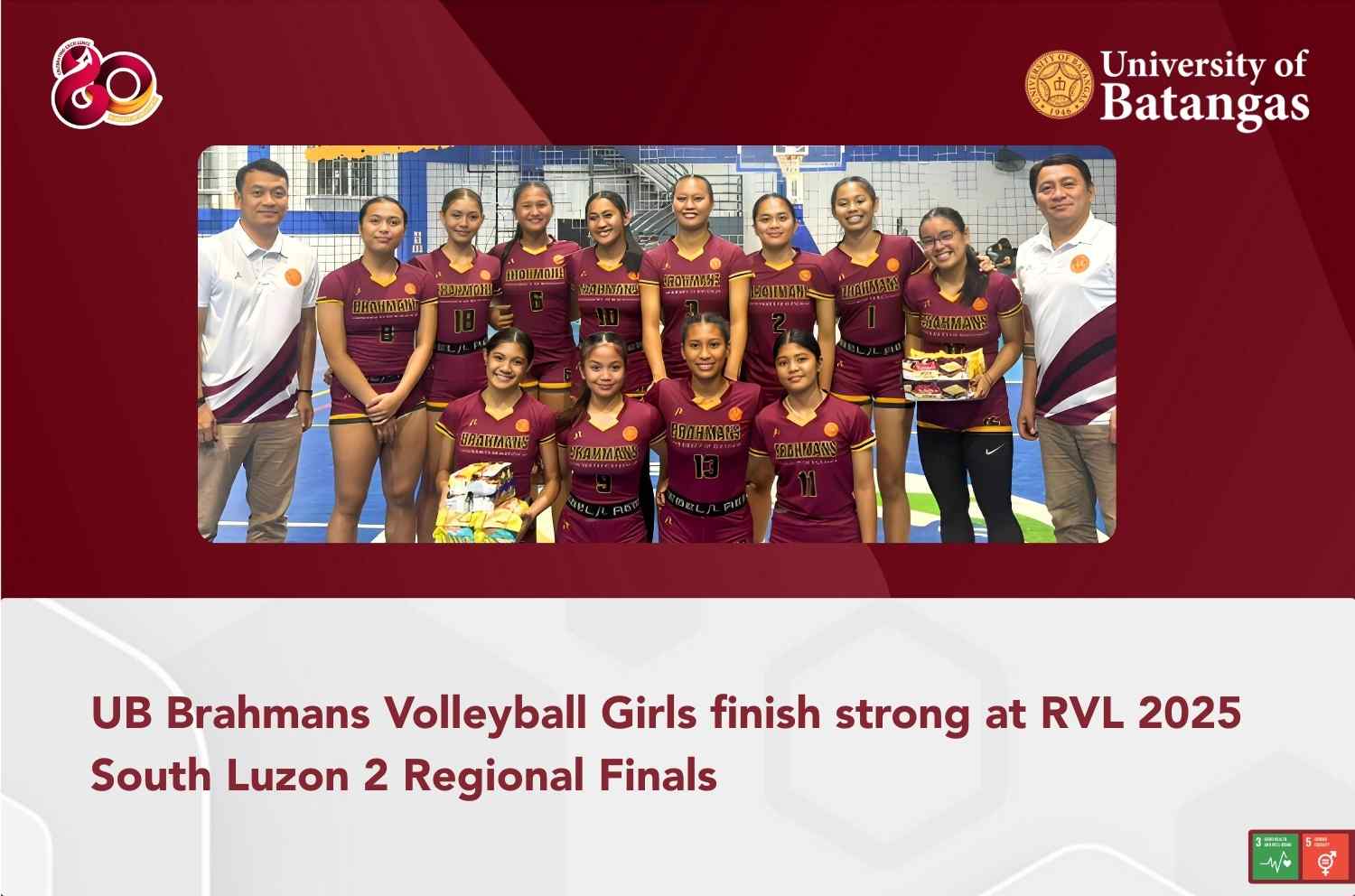 The University of Batangas (UB) Brahmans Volleyball Girls Team bagged the bronze award at the REBISCO Volleyball League (RVL) 2025 South Luzon 2 – Regional Finals for the 18 &
