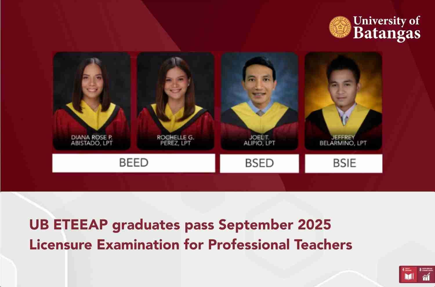 The University of Batangas (UB) marked another academic success after its graduates passed the September 2025 Licensure Examination for Professional Teachers (LEPT), with results released on December 18, 2025. Graduates