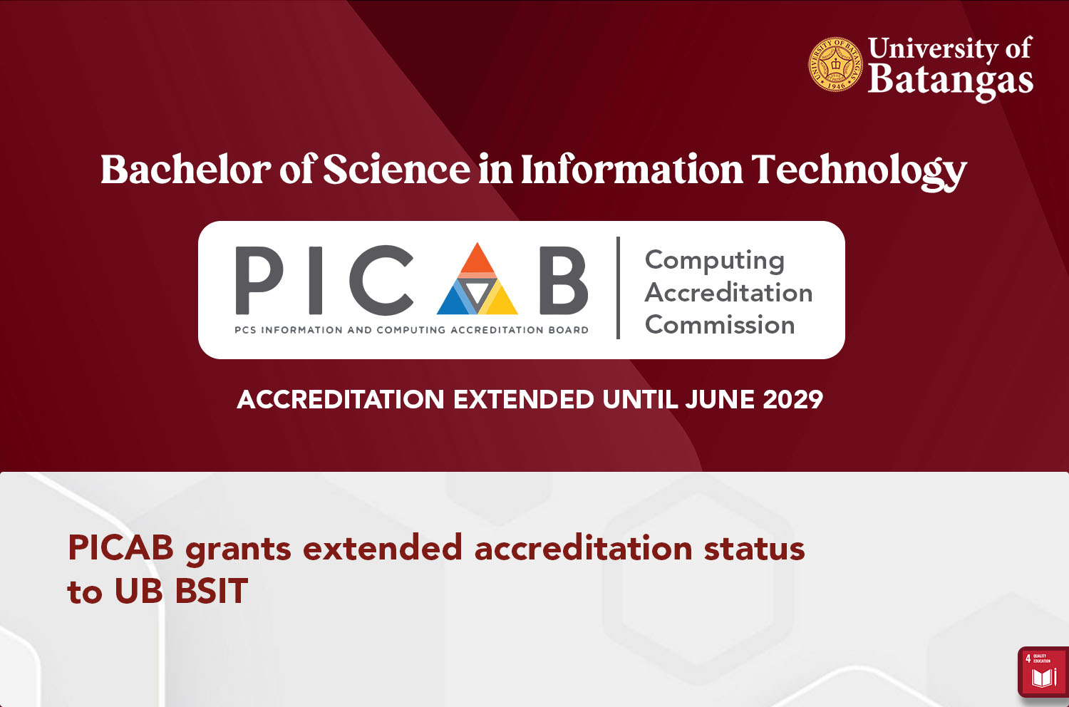 The PCS Information and Computing Accreditation Board (PICAB) granted an extended accreditation status to the University of Batangas’ (UB) Bachelor of Science in Information Technology (BSIT) under the College of Information and Communications Technology (CICT) on September 4, 2025.