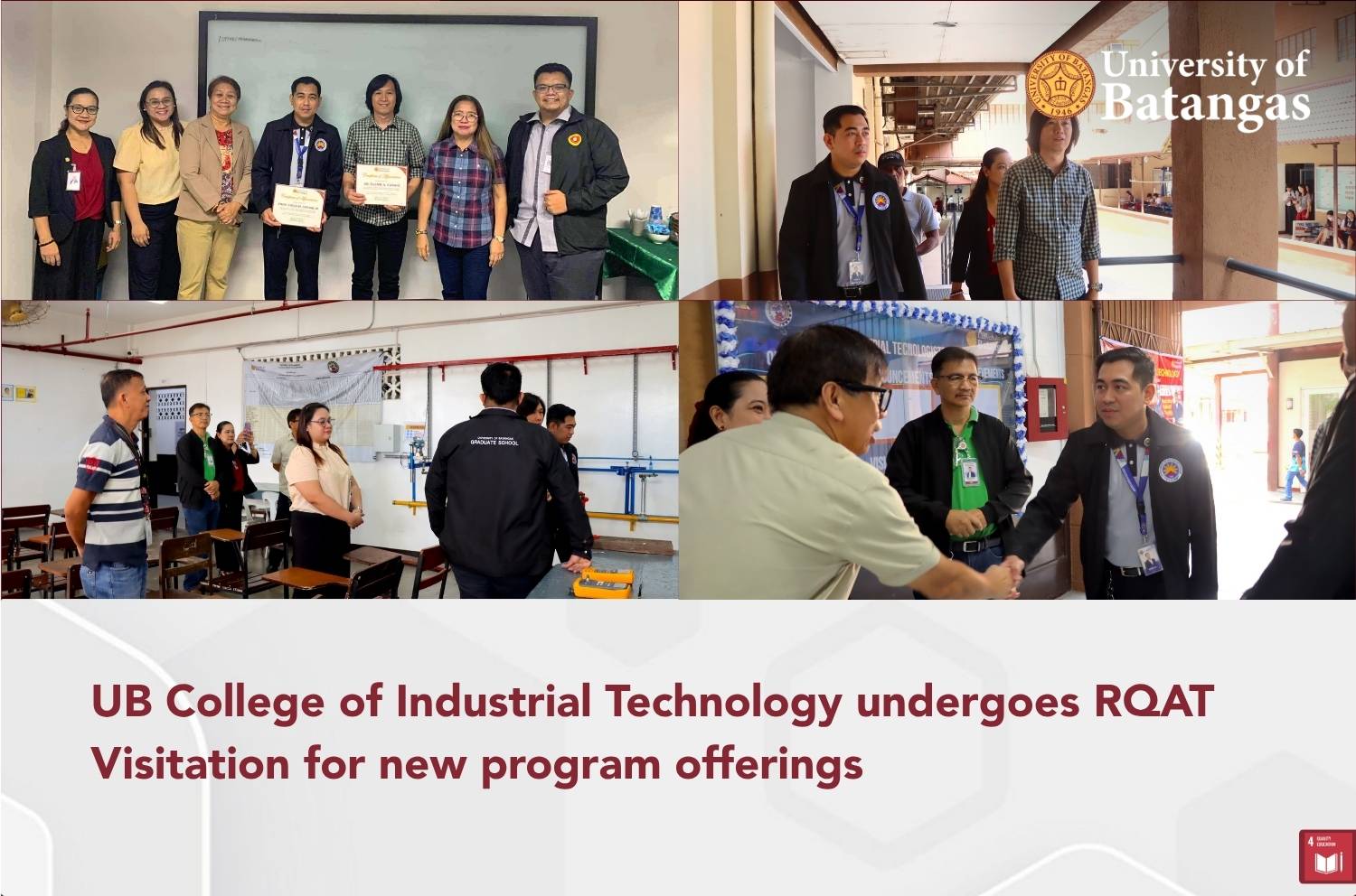 In its continuous pursuit of academic excellence, the University of Batangas (UB) College of Industrial Technology (CIT) welcomed the Regional Quality Assessment Team (RQAT) for the evaluation of its new program offerings – Bachelor of Industrial Technology major in Instrumentation and Control Technology and Bachelor of Industrial Technology major in Electrical Technology on October 21, 2025 at the CAB Room, Juan Y. Javier Hall (Building C).