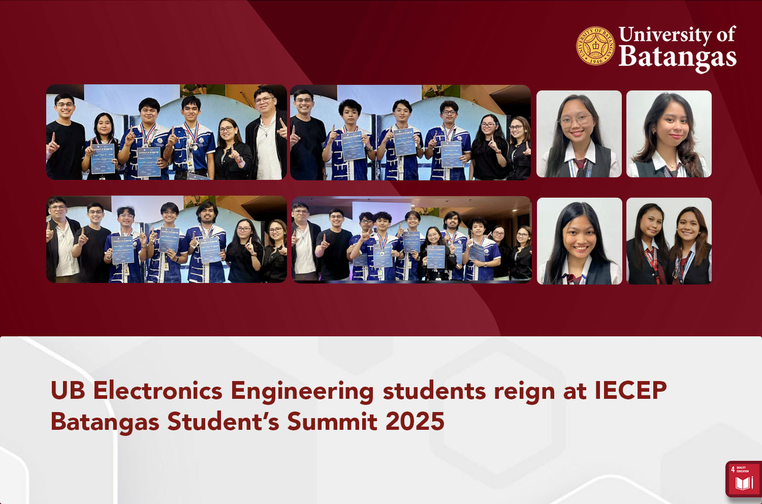 University of Batangas (UB) Bachelor of Science in Electronics Engineering (BSECE) students triumphed at the Institute of Electronics Engineers of the Philippines (IECEP) Batangas Student’s Summit 2025 Provincial Academic Competition, held at De La Salle Lipa, Lipa City, Batangas on October 4, 2025.