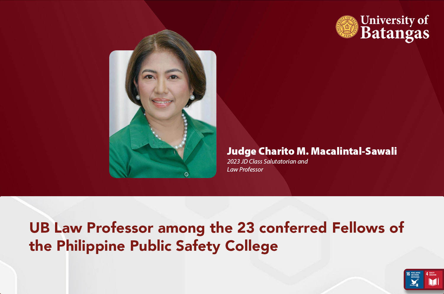 More than a calling – Judge Charito M. Macalintal-Sawali, Class Salutatorian of Batch 2003 of Juris Doctor and the University of Batangas (UB) College of Law Professor, was conferred as a Fellow of the Philippine Public Safety College (PPSC) on October 8, 2025, at the PPSC Head Office Building, Quezon City.
