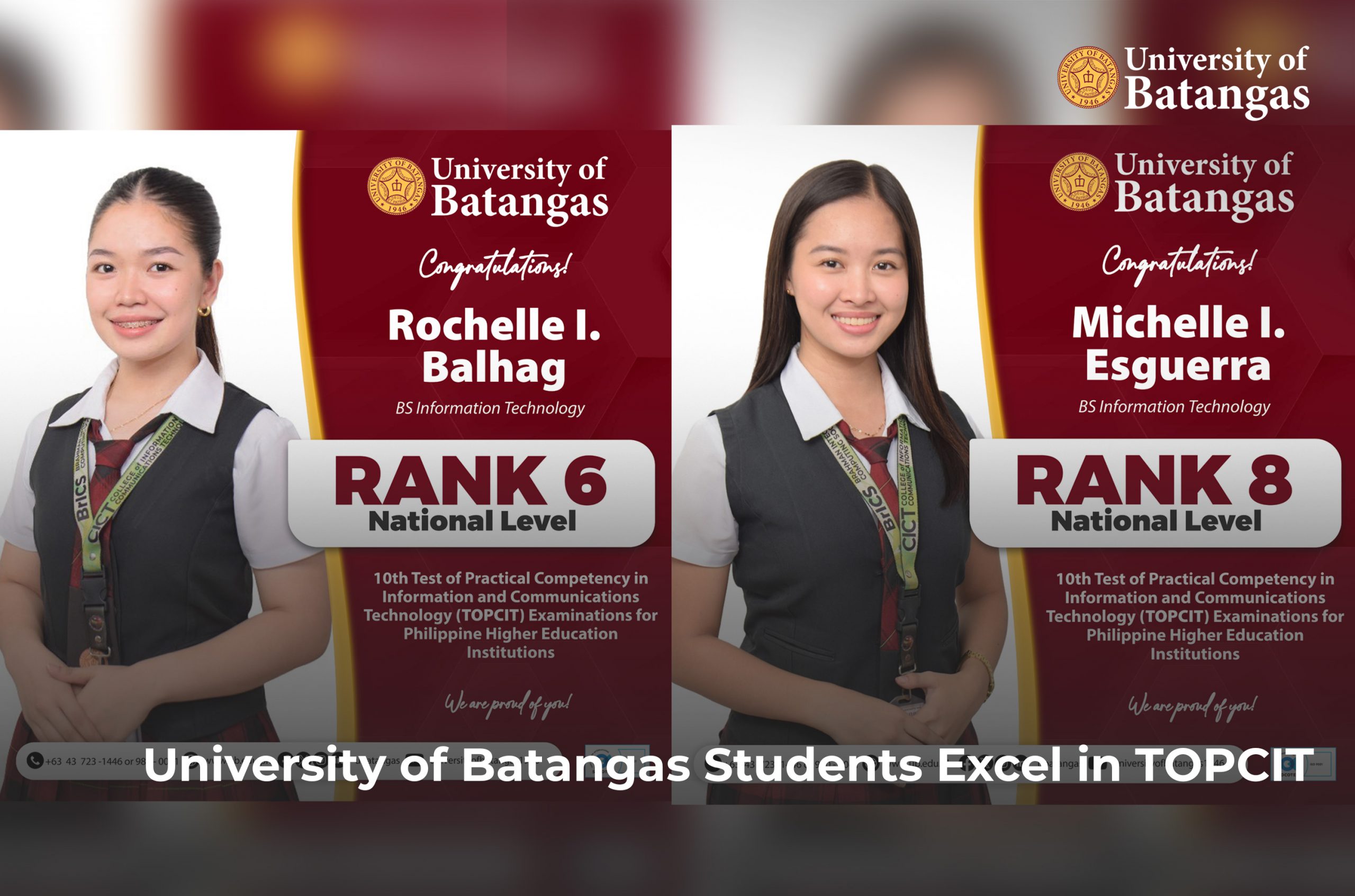 The University of Batangas – Batangas City Campus proudly celebrates the outstanding achievements of Ms. Rochelle I. Balhag and Ms. Michelle O. Esguerra, students from the College of Information and Communications Technology (CICT), who ranked 6th and 8th nationwide, respectively, in the 10th Test of Practical Competency in Information and Communications Technology (TOPCIT) Examinations.