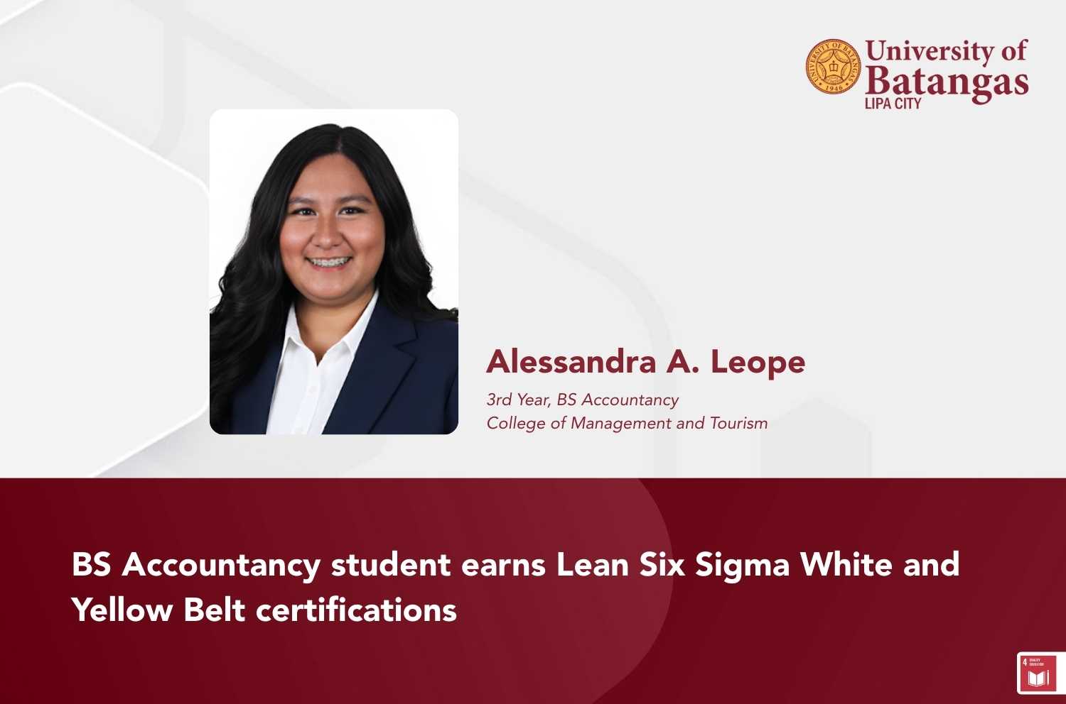 Alessandra A. Leope, a Bachelor of Science in Accountancy student from the College of Management and Tourism, recently earned her Lean Six Sigma White Belt and Yellow Belt certifications under the Council for Six Sigma Certification (CSSC), the global leader in Six Sigma accreditation. These certifications, conferred on November 03, 2025, underscore her mastery of foundational and intermediate Lean Six Sigma principles centered on efficiency, process improvement, and data-driven problem-solving. Completed within the program batch that ran from October 25 to November 22, 2025, Leope’s accomplishment marks a significant advancement in her professional readiness.