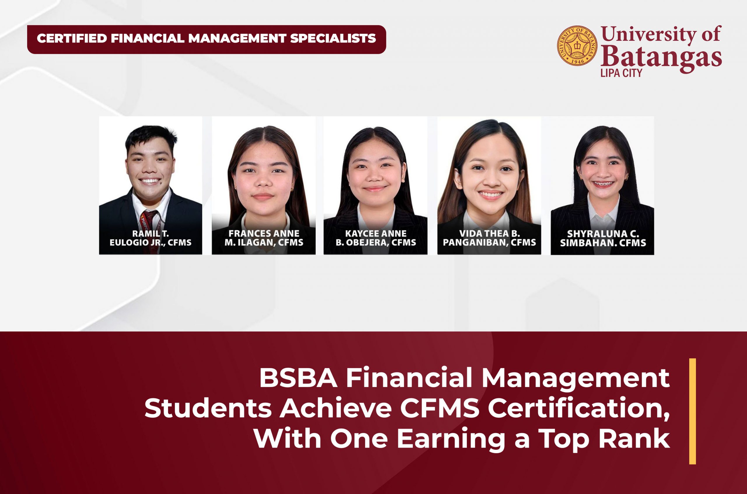 A huge congratulations to our BS Business Administration (Major in Financial Management) students from the College of Management and Tourism for attaining their Certified Financial Management Specialist (CFMS) titles!