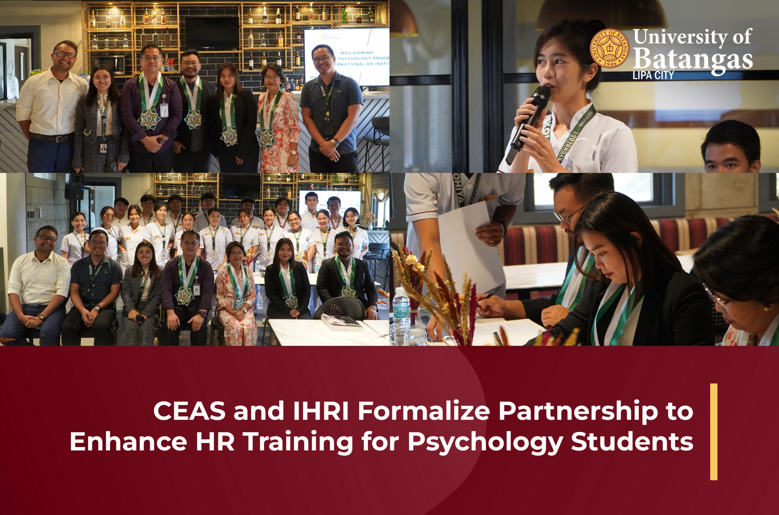The College of Education and Arts Sciences (CEAS) at the University of Batangas Lipa Campus formally signed a Memorandum of Understanding (MoU) with the International HR Institute (IHRI) on April 25, 2025, establishing a collaborative partnership aimed at strengthening the professional readiness of BS Psychology students.