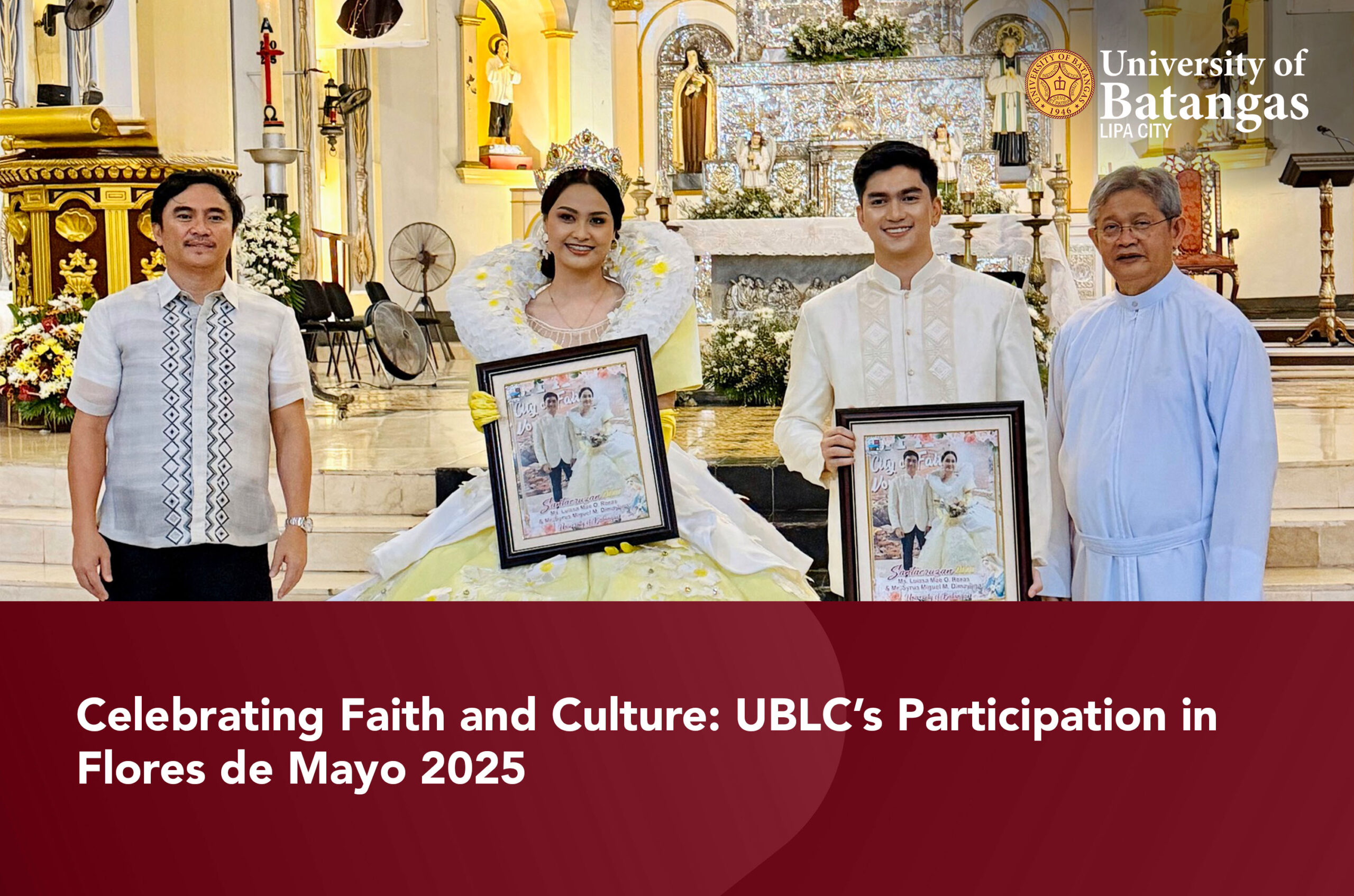 On May 25, 2025, the University of Batangas, Lipa City (UBLC) proudly participated in the annual Flores de Mayo celebration organized by the Lipa City Government. Representing the university were Ms. Luissa Mae O. Roxas, a BS Tourism student, and Mr. Syrus Miguel M. Dimayuga, a BS Hospitality Management student, both from the College of Management and Tourism.