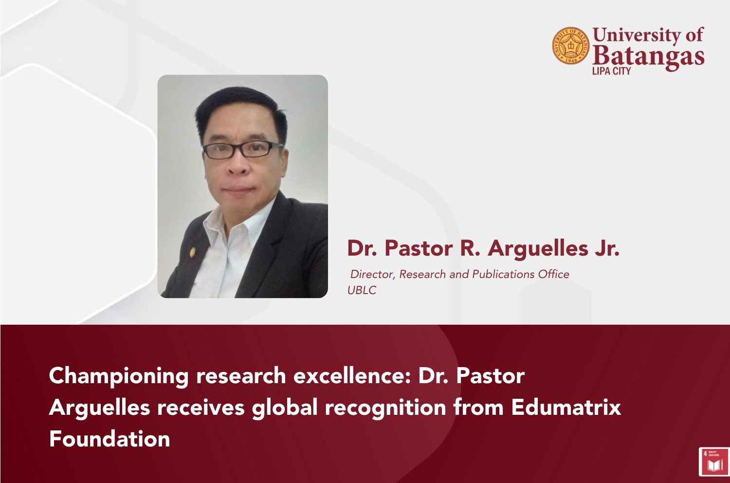 Lipa City, Batangas – September 14, 2025. Dr. Pastor R. Arguelles Jr., Director of the Research and Publications Office of the University of Batangas Lipa City (UBLC), has been conferred the prestigious “Dr. Radhakrishnan Excellence Award 2025” as Excellent Researcher by the Edumatrix Foundation, in recognition of his valuable contribution to academics and research. The award was given on the occasion of World Teachers’ Day 2025.