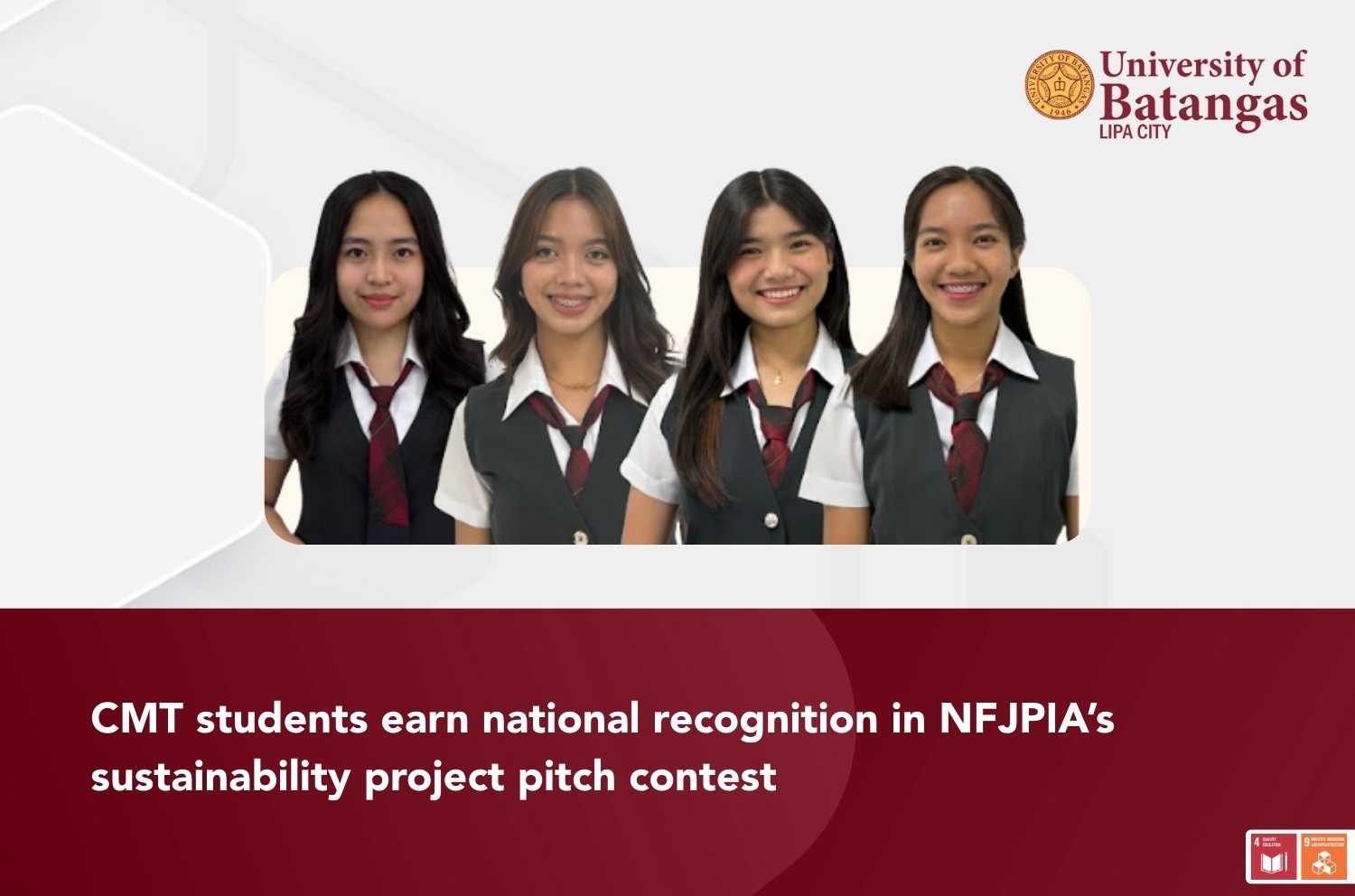 Team Fiscal Bloom from the University of Batangas Lipa City (UBLC) College of Management and Tourism (CMT) earned second place in the Project Pitch Competition of NEXTGEN: The Sustainability Leadership Summit 2025, organized by the National Federation of Junior Philippine Institute of Accountants (NFJPIA) National Council. The event, which celebrated youth-driven sustainability initiatives, served as a national platform for future leaders committed to creating long-term, community-centered solutions.