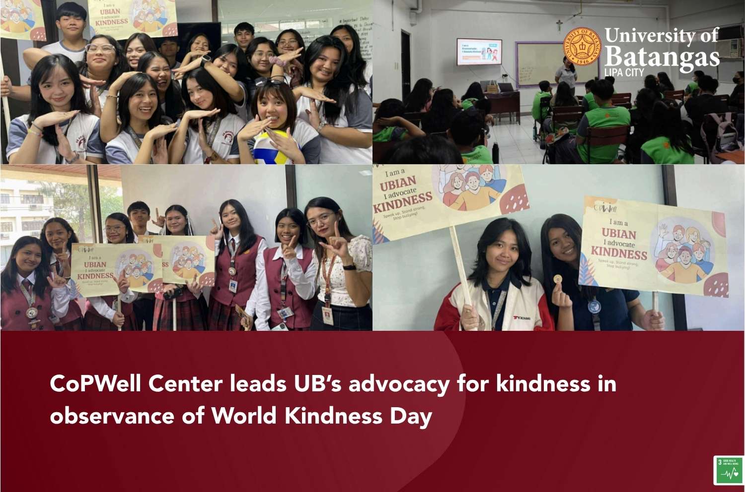 In celebration of World Kindness Day and the Anti-Bullying Campaign Week, the University of Batangas (UB), through the Counseling and Psychological Wellness Center (CoPWell), spearheaded a university-wide initiative titled “I am a UBian, I Advocate Kindness” on November 13, 2024. The campaign highlighted the institution’s commitment to promoting empathy, respect, and inclusivity within the UBian community.