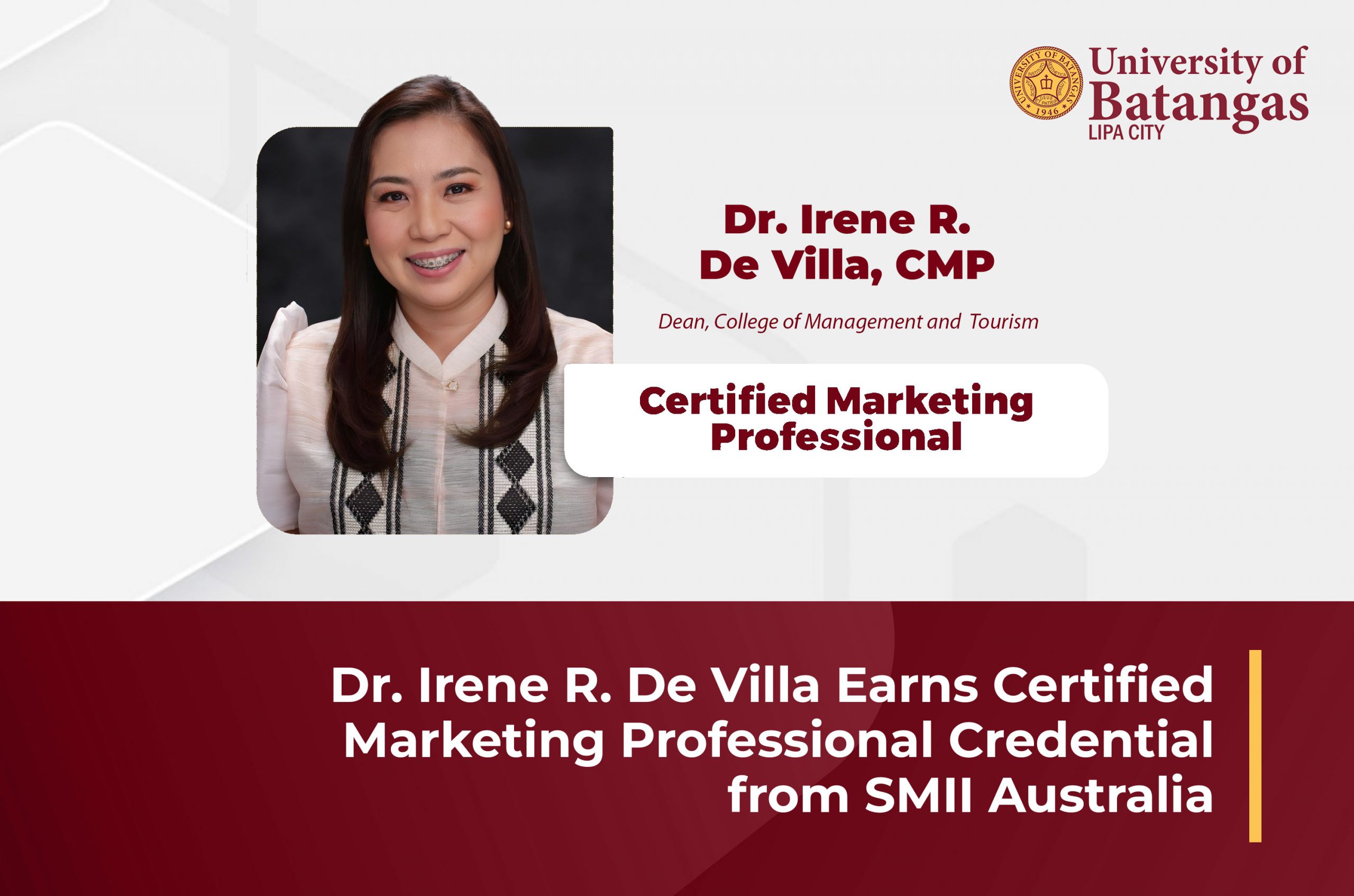The University of Batangas Lipa City proudly celebrates the recent achievement of Dr. Irene R. De Villa, CMP, Dean of the College of Management and Tourism, as she receives the prestigious Certified Marketing Professional (CMP) designation. This certification was awarded by the Sales and Marketing Institute International (SMII), Australia, in January 2025.