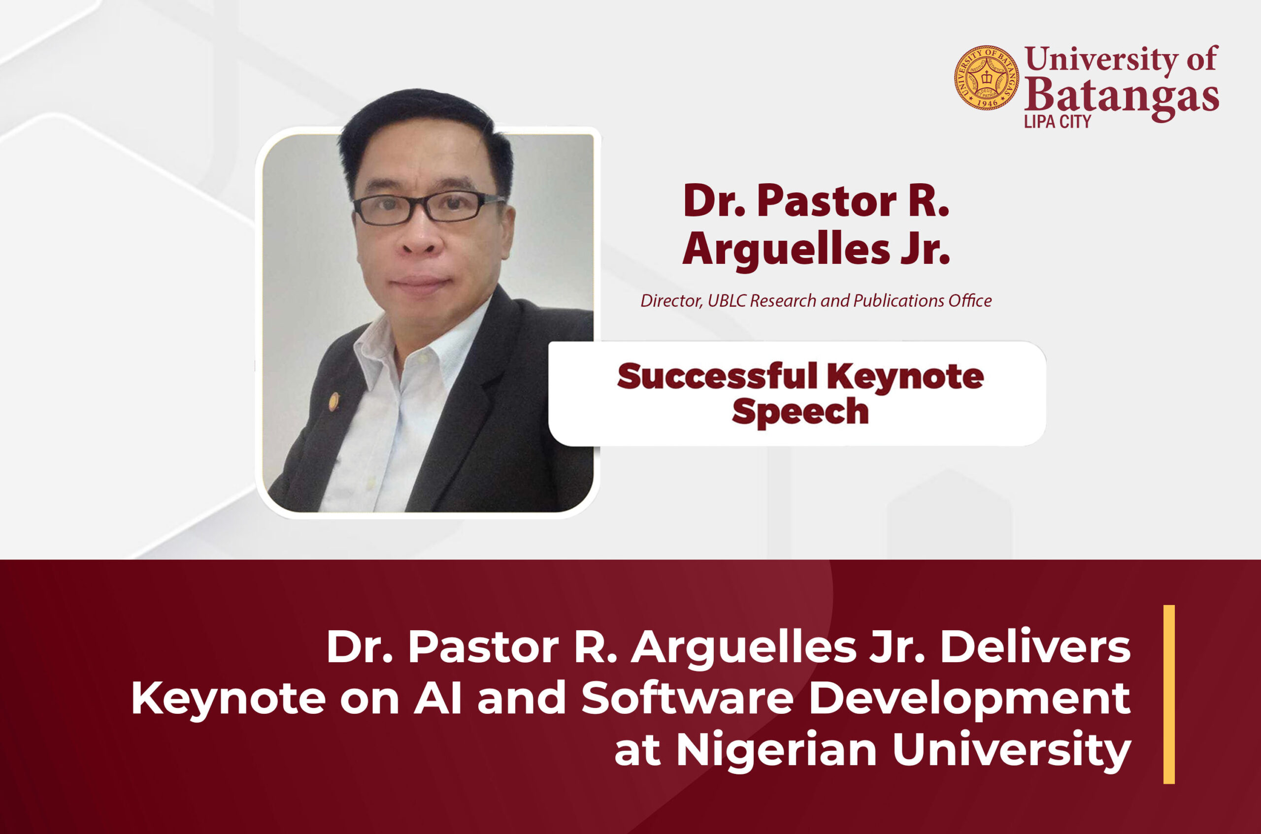 Dr. Pastor R. Arguelles Jr., a delegate of the University of Batangas Lipa City Research and Publications Office (UBLC RPO), was recently a keynote speaker in an international academic conference of the Maryam Abacha American University of Nigeria.