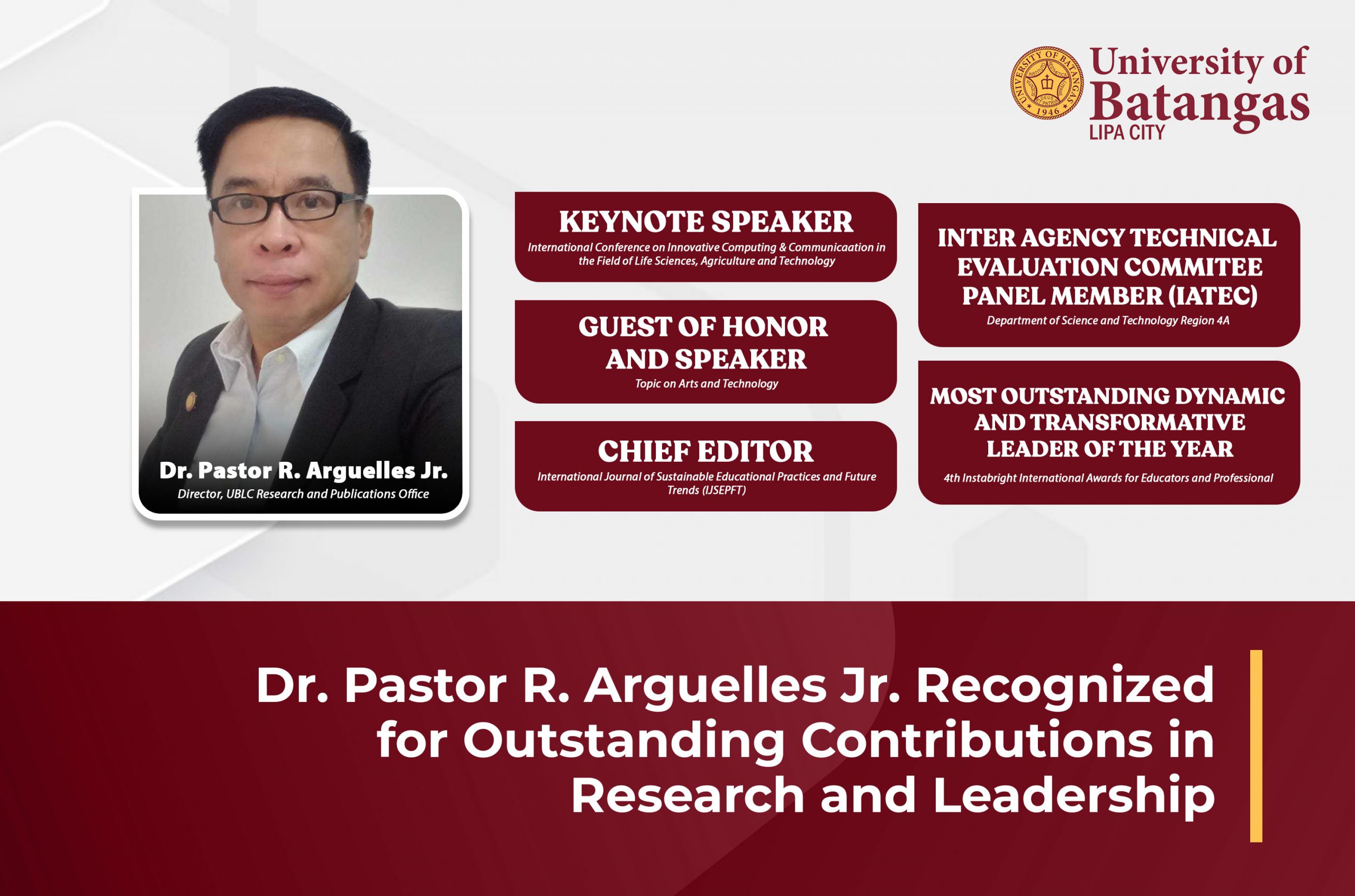 The University of Batangas Lipa City proudly recognizes Dr. Pastor R. Arguelles Jr., Director of the UBLC Research and Publications Office, for his remarkable achievements in academia, research, and leadership. His recent accolades and appointments solidify his role as a thought leader in education, technology, and sustainable practices.