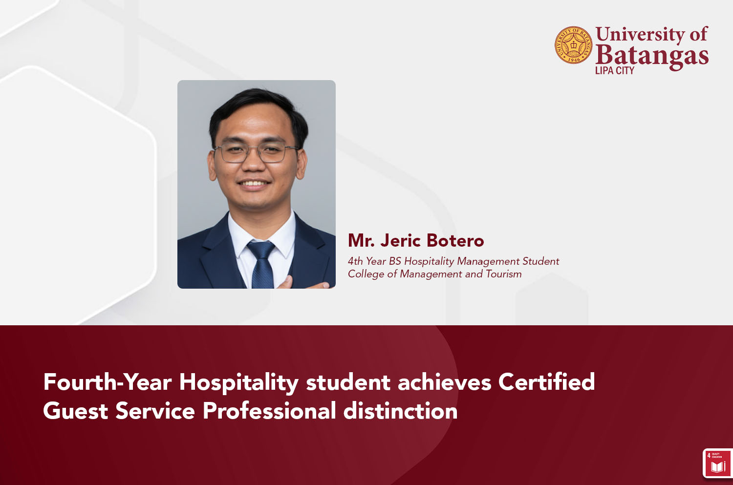 Lipa City, Batangas – October 3, 2025. Jeric Botero, a fourth-year BS Hospitality Management student from the College of Management and Tourism of the University of Batangas Lipa City (UBLC), has earned the Certified Guest Service Professional (CGSP) designation awarded by the American Hotel & Lodging Association (AHLA) through its educational arm, the American Hotel & Lodging Educational Institute (AHLEI).