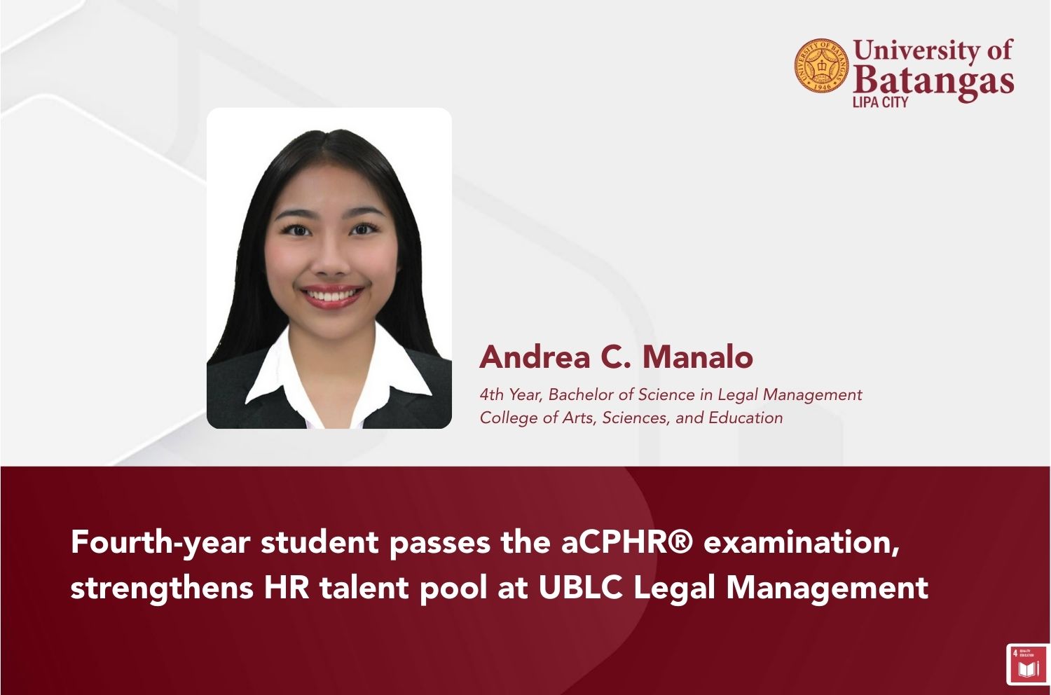Fourth-year BS Legal Management student Andrea C. Manalo of the University of Batangas–Lipa Campus has successfully passed the Associate Certified Practitioner in Human Resources (aCPHR®) Examination held online on October 17, 2025, officially joining the roster of certified human resource practitioners in the Philippines. Her achievement marks a significant milestone, reflecting both academic excellence and emerging professional competence in the field of human resources.