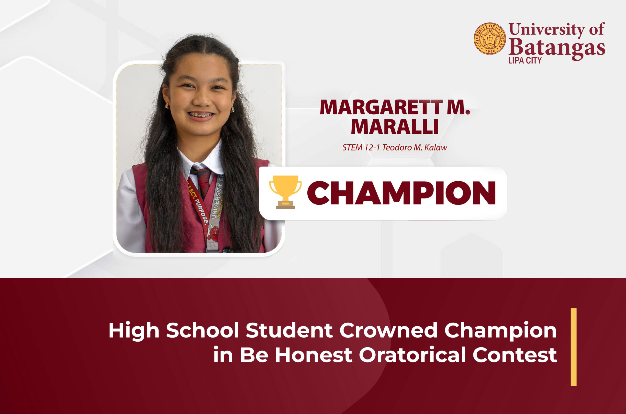 This achievement reflects her hard work and the guidance of her mentors, as well as the school’s continued support for student development in public speaking and values education. The University of Batangas Lipa City community congratulates her on this well‑deserved accomplishment.