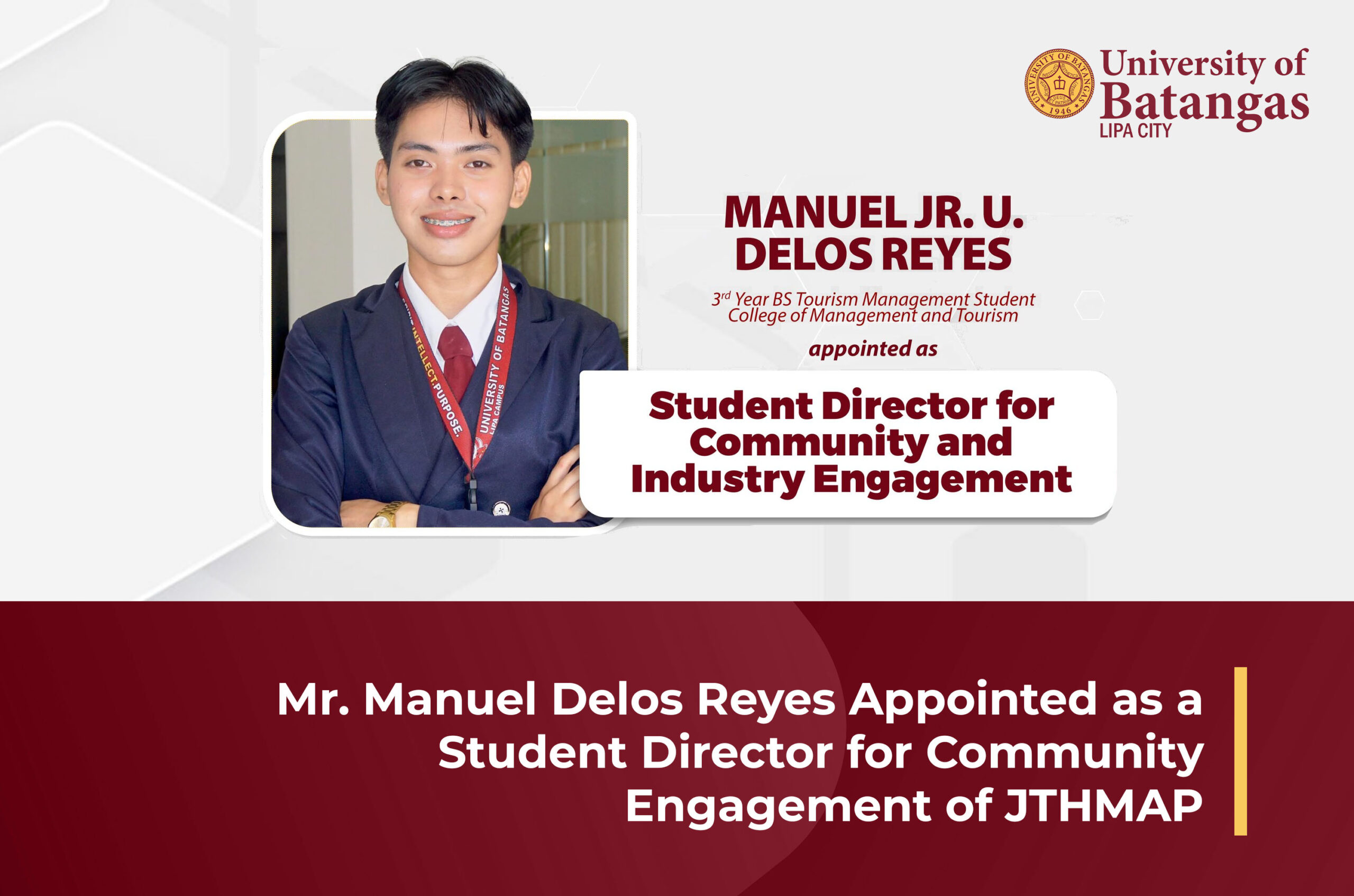 Mr. Manuel Jr. U. Delos Reyes, a third-year BS Tourism Management student from the University of Batangas Lipa City (UBLC) – College of Management and Tourism, has been appointed as the Student Director for Community and Industry Engagement of the Junior Tourism and Hospitality Management Association of the Philippines (JTHMAP).