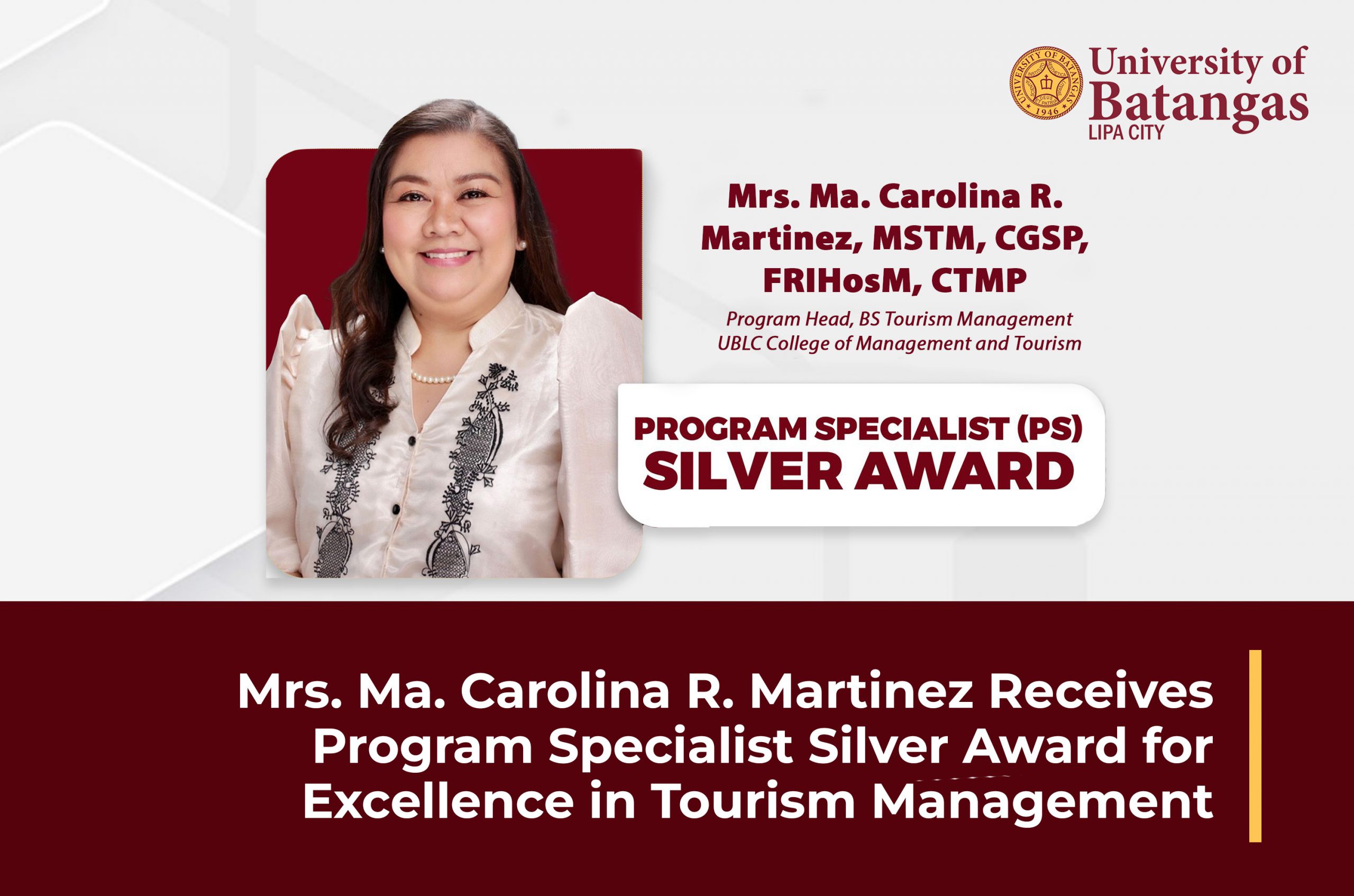 The University of Batangas congratulates Mrs. Ma. Carolina R. Martinez, Program Head of the Bachelor of Science in Tourism Management under the UBLC College of Management and Tourism, for receiving the Program Specialist (PS) Silver Award. The award was presented during the 2nd Eight Star Awards Ceremony held last December 16, 2024, at Novotel Manila. This recognition highlights Mrs. Martinez’s dedication to the field of tourism management, her leadership, and her commitment to maintaining high standards in education and industry practices.