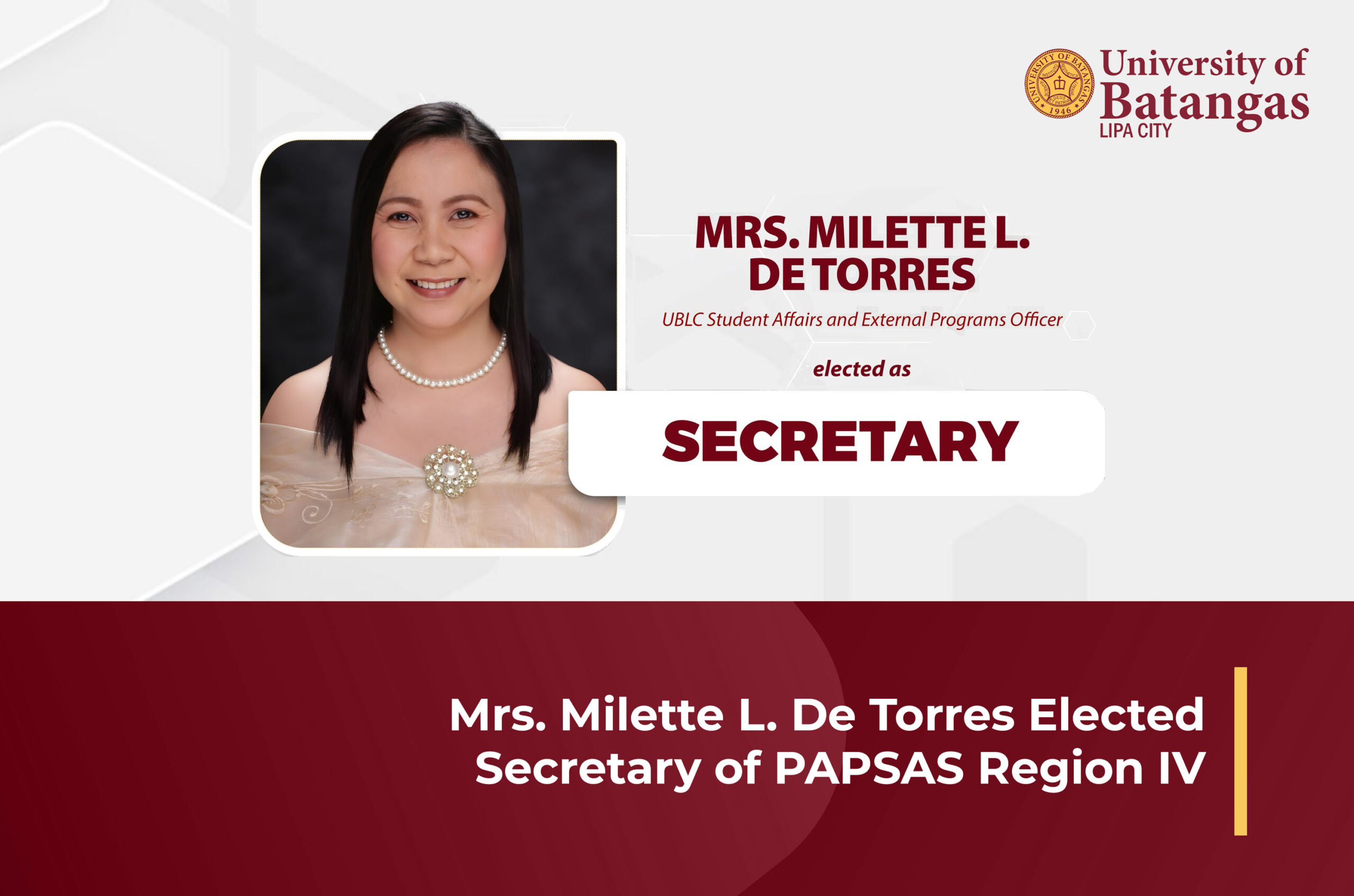 Mrs. Milette L. De Torres, the Student Affairs and External Programs Officer, has been elected as the Secretary of the Philippine Association of Practitioners of Student Affairs and Services (PAPSAS) – Region IV.
