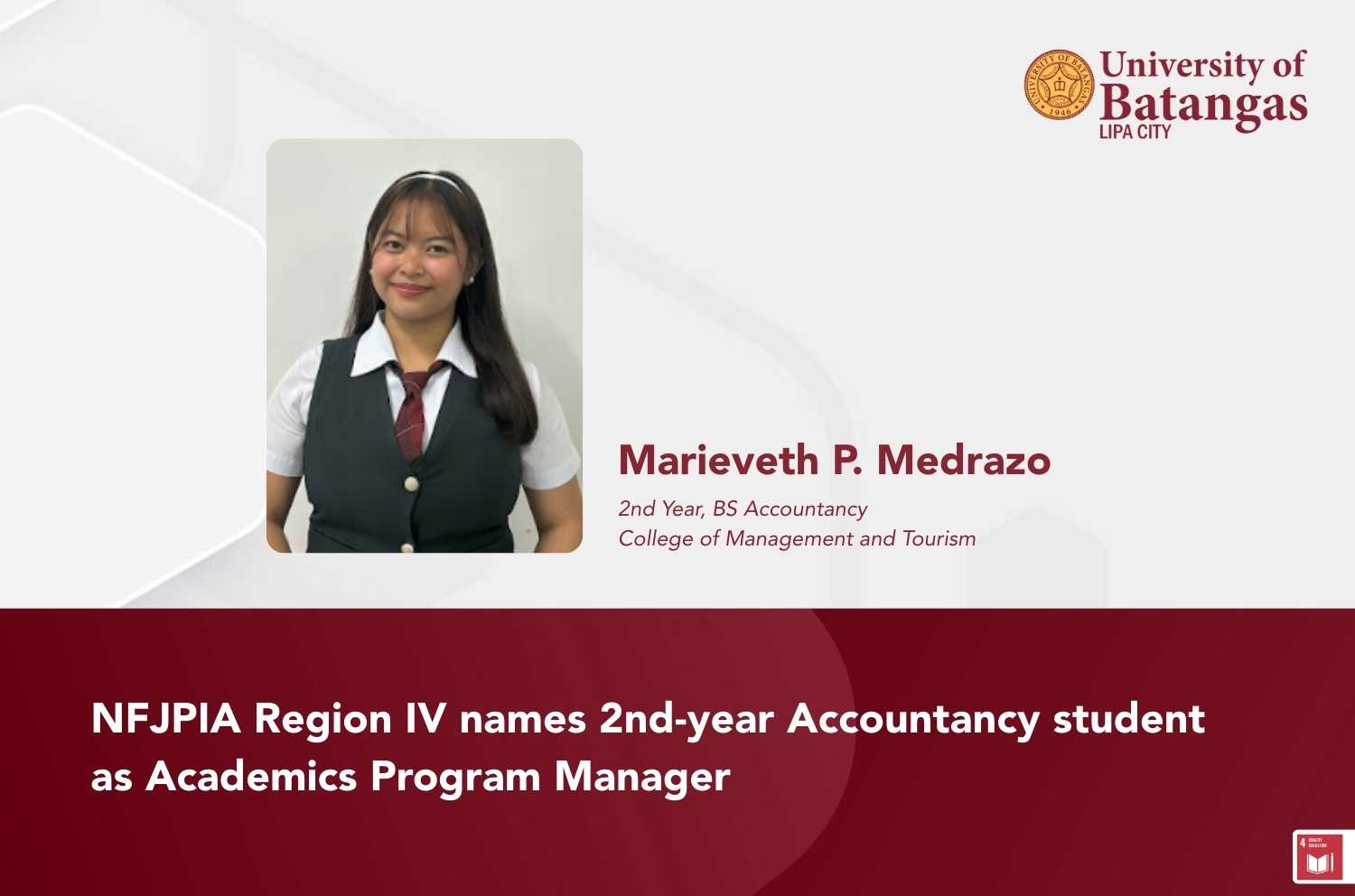 Marieveth P. Medrazo, a second-year BS Accountancy student from the College of Management and Tourism, has been appointed Program Manager for the Academics Department of NFJPIA Region IV for the Federation Year 2025–2026. The National Federation of Junior Philippine Institute of Accountants (NFJPIA) is a professional organization that promotes student leadership, civic engagement, and community development among aspiring accountants.