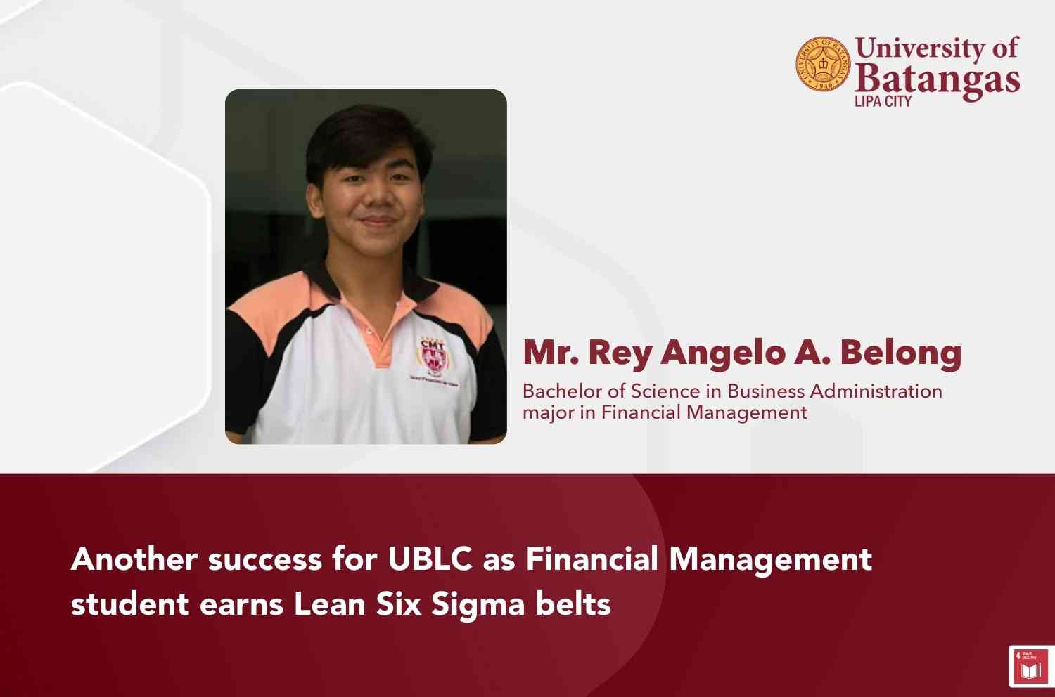 A third-year Bachelor of Science in Business Administration major in Financial Management student from the University of Batangas Lipa City, Rey Angelo A. Belong successfully earned his Certified Lean Six