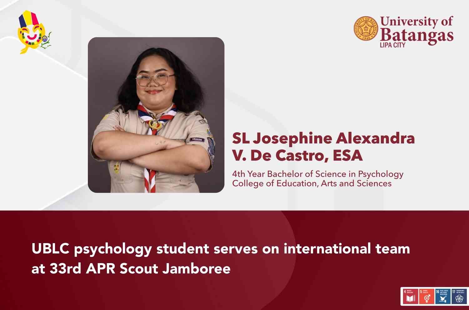 The University of Batangas Lipa City (UBLC) marked another milestone in student civic engagement as SL Josephine Alexandra V. De Castro, ESA, a fourth-year Bachelor of Science in Psychology student,