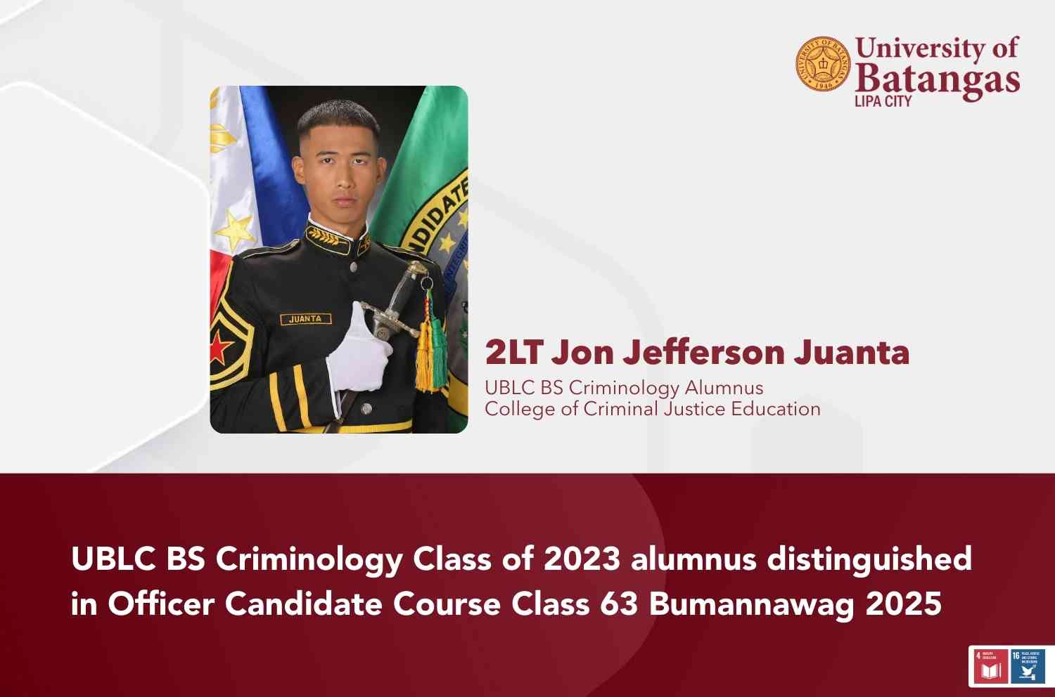The University of Batangas Lipa City (UBLC) recognizes 2LT Jon Jefferson Juanta for his distinction as the Alfa Company Brigade Sergeant Major under Officer Candidate Course Class 63 Bumannawag 2025