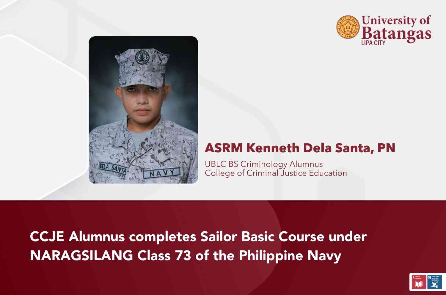 The University of Batangas Lipa City (UBLC) recognizes the achievement of ASRM Kenneth Dela Santa, PN, following his successful completion of the Sailor Basic Course under NARAGSILANG Class 73 of