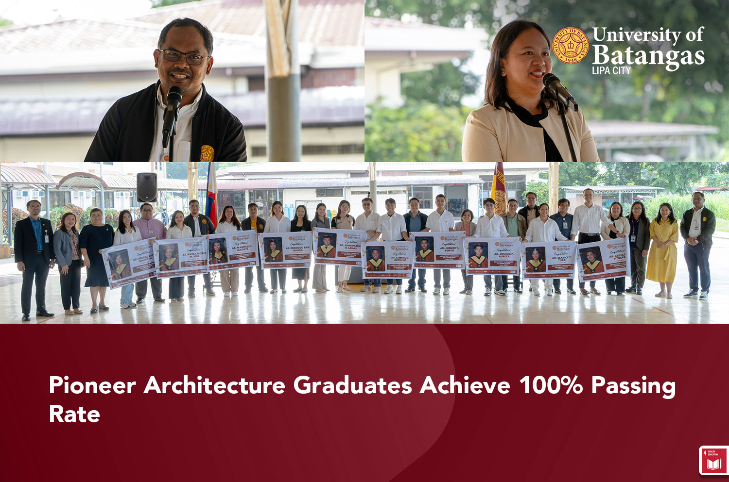 The University of Batangas Lipa City proudly congratulates its first batch of BS Architecture graduates from the College of Engineering and Architecture for achieving a perfect 100% passing rate in the recent Architect Licensure Examination.