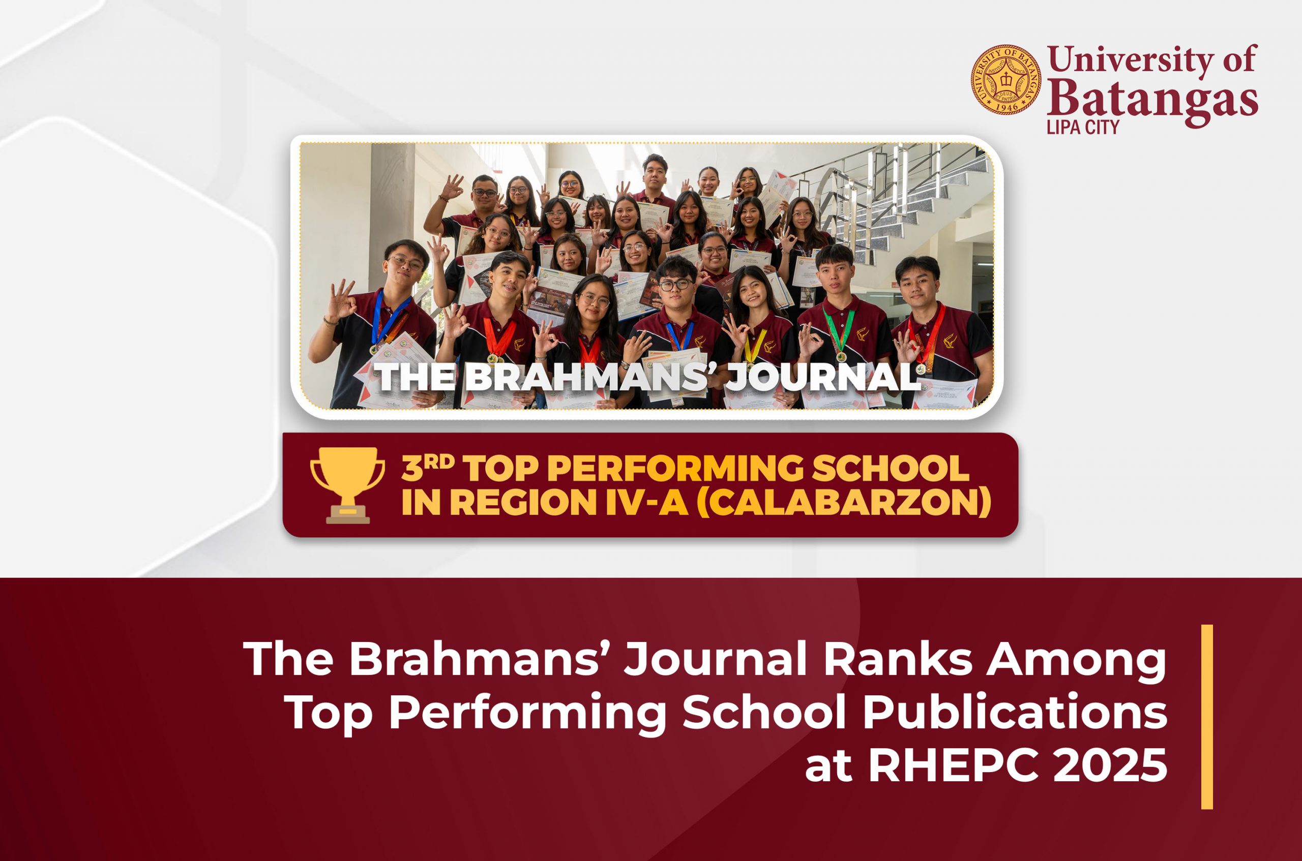 Celebrating its tenth year, The Brahmans’ Journal (TBJ) has achieved a significant milestone, securing its place as the third-best performing school publication at the Regional Higher Education Press Conference (RHEPC) 2025. The event, held from February 18-20 at Batis Aramin Resorts and Hotel in Lucban, Quezon, brought together nearly 600 delegates from 34 universities across the region.