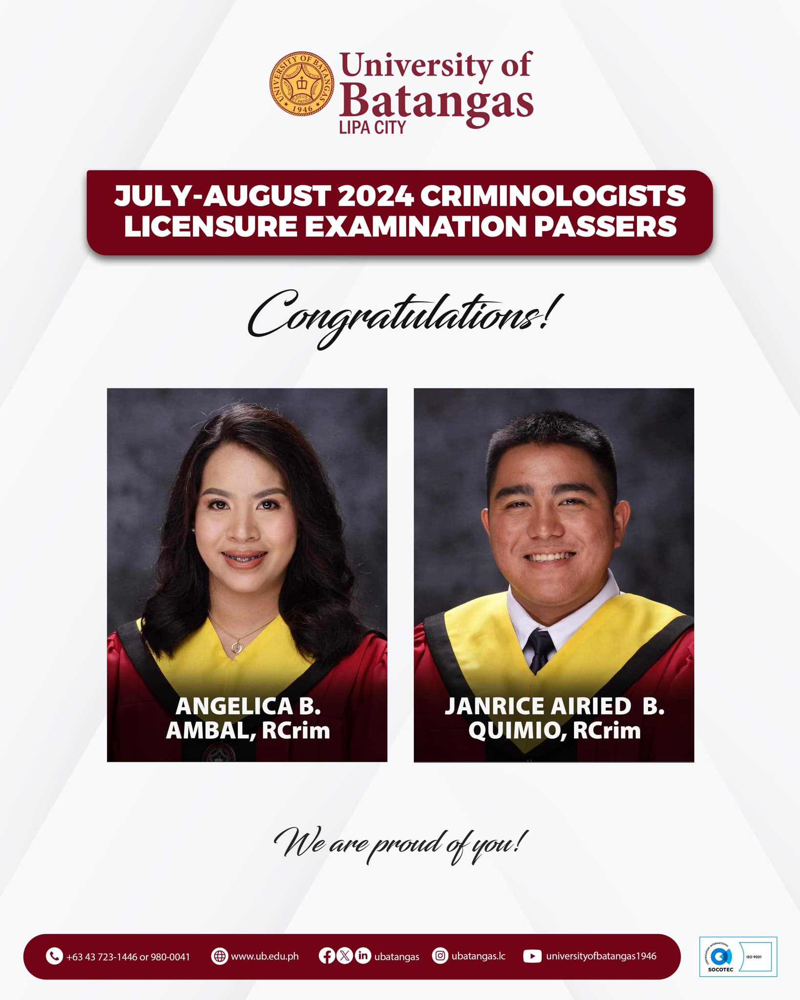 Congratulations to our newly licensed criminologists! Your hard work and perseverance have paid off, and you’ve made the entire UB Lipa community proud. We look forward to seeing the positive impact you’ll have on the field of criminal justice.