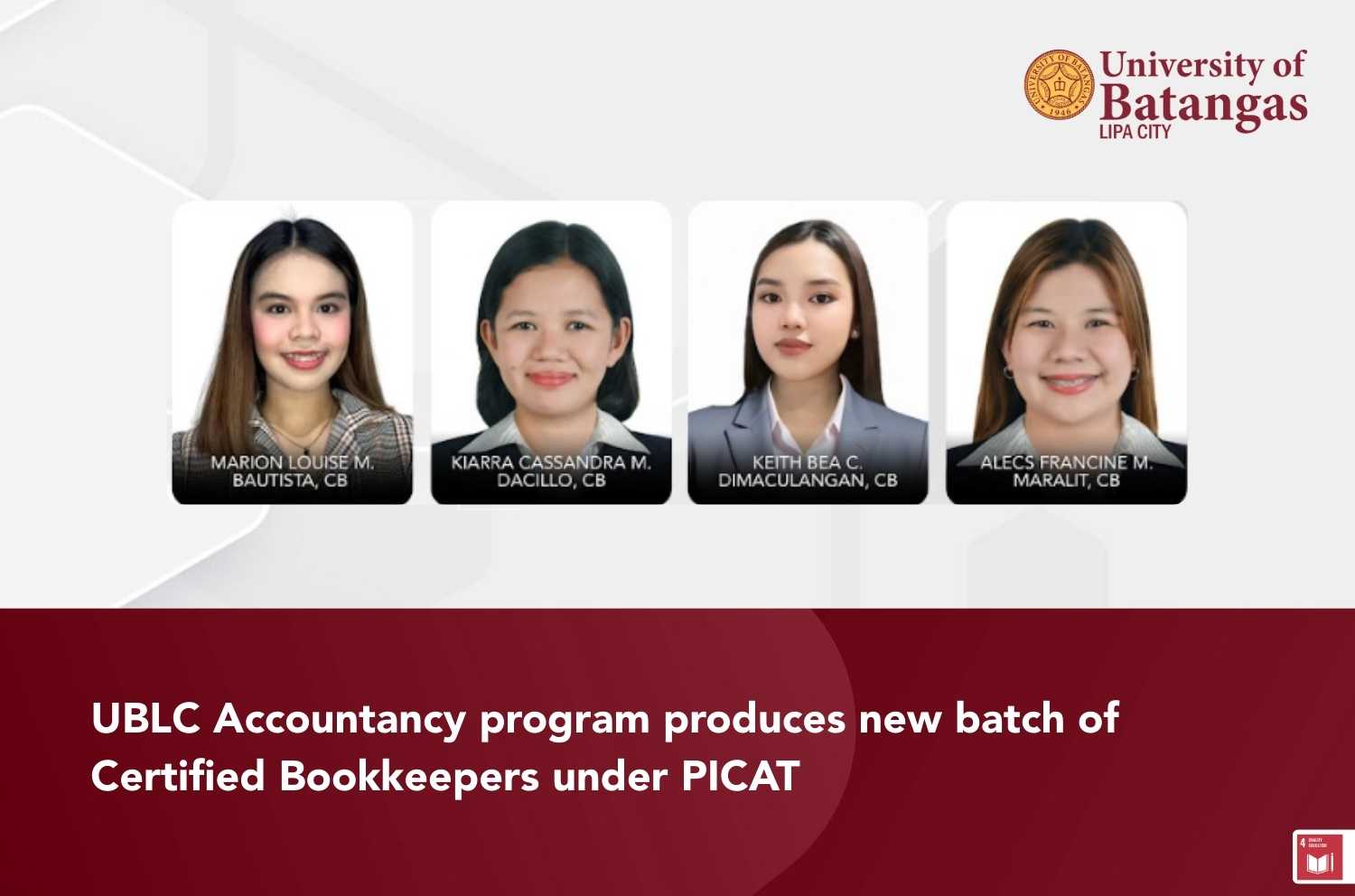 Earning the Certified Bookkeeper credential is a significant professional milestone that validates competence, promotes confidence, and affirms ethical integrity in the field of accounting. For the University of Batangas Lipa City, this success highlights the hard work and dedication of its Accountancy students and underscores the university’s continued commitment to academic excellence and professional development.