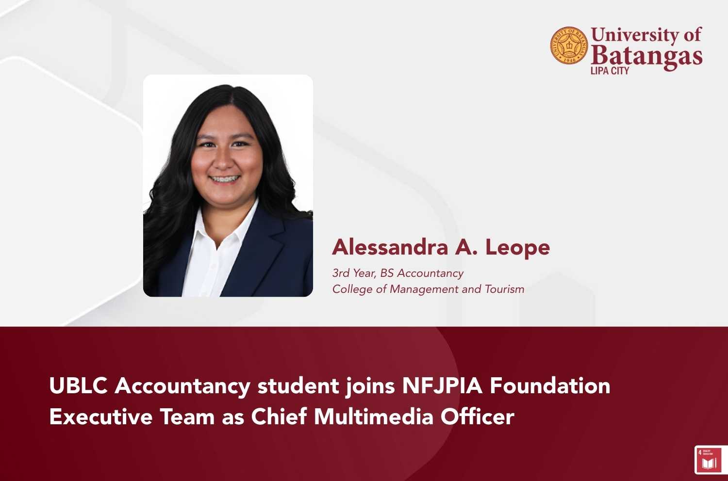 Alessandra A. Leope, a 3rd-year Accountancy student, has been appointed Chief Multimedia Officer of the NFJPIA Foundation Executive Team for Federation Year 2025–2026. The NFJPIA Foundation, a socio-civic program organized by the National Federation of Junior Philippine Institute of Accountants (NFJPIA), advocates for building a better community through civic engagement and service.