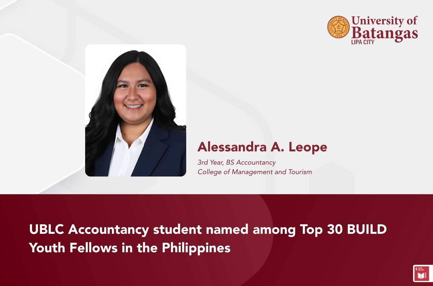 Alessandra A. Leope, a third-year BS Accountancy student from the University of Batangas Lipa City’s College of Management and Tourism, has been selected as one of the Top 30 BUILD Fellows in the Philippines under the BUILD Youth Fellowship 2025 organized by BUILD Pilipinas. The fellowship, which accepts young Filipinos aged 18 to 25, identifies and trains emerging youth leaders committed to advancing digital advocacy, responsible online engagement, and community-based leadership.