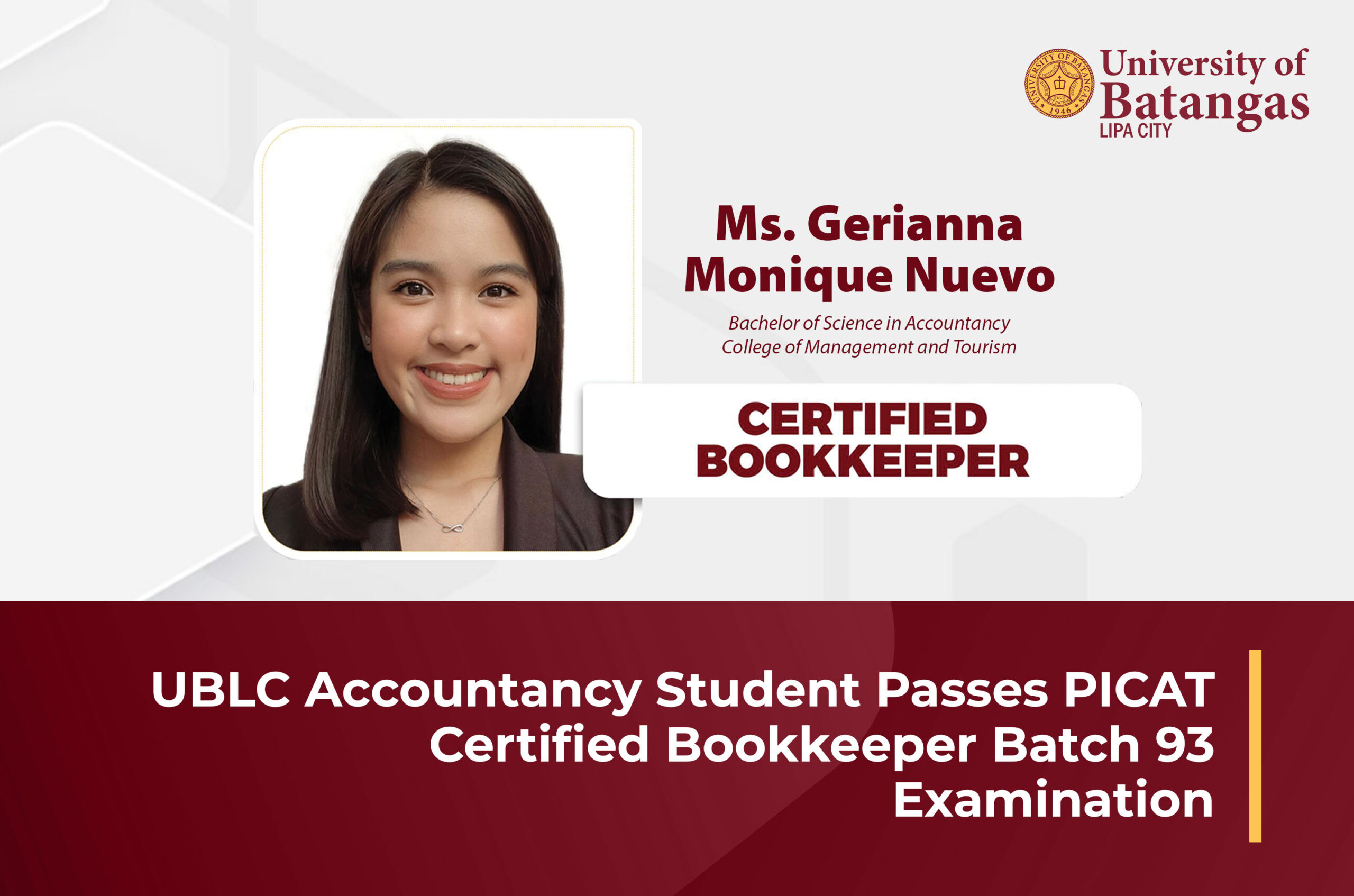 A Bachelor of Science in Accountancy student from the University of Batangas Lipa City (UBLC) – College of Management and Tourism has successfully passed the Philippine Institute of Certified Accounting Technologists (PICAT) Certified Bookkeeper Batch 93 Examination.