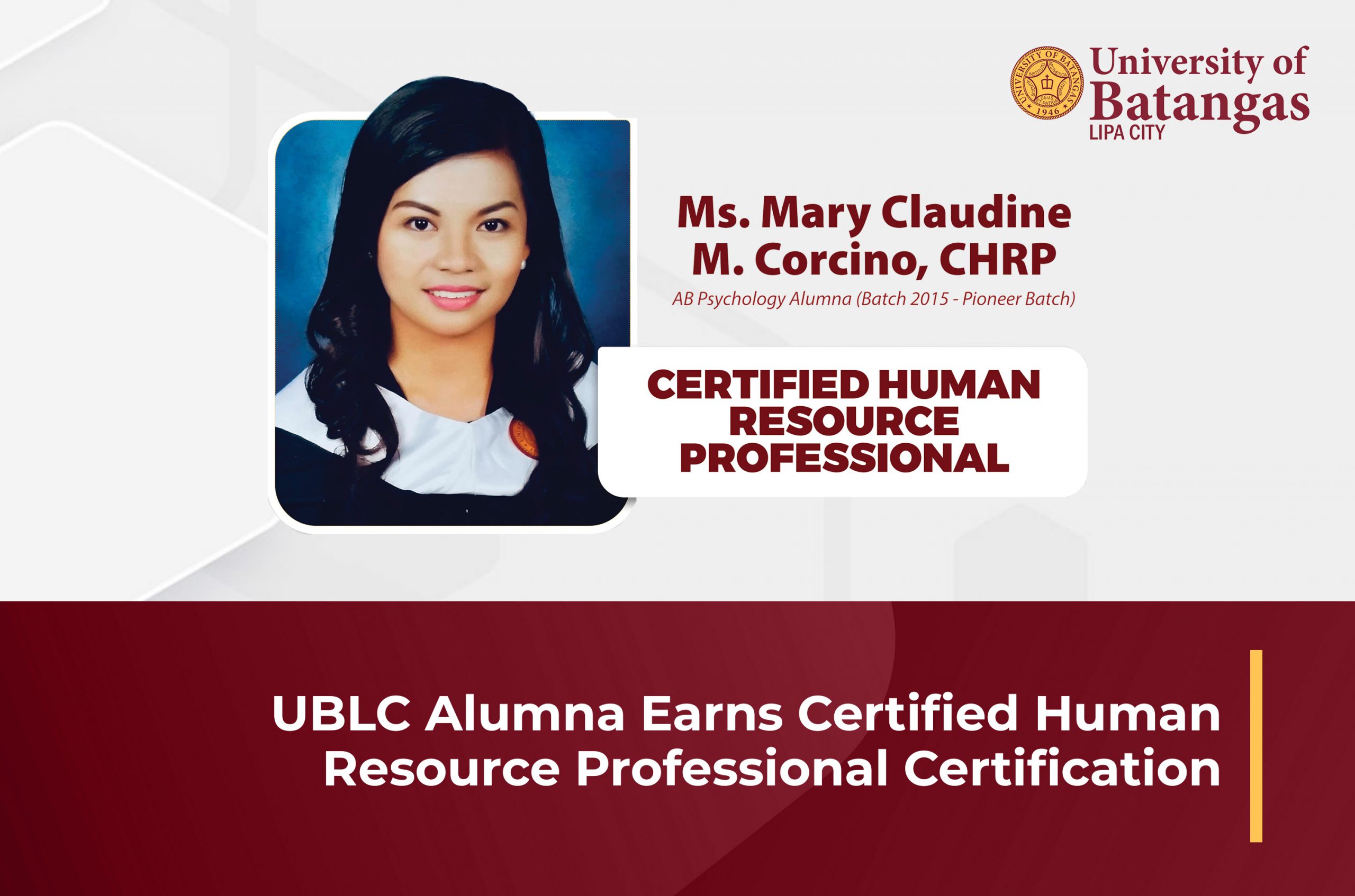 The University of Batangas Lipa City proudly congratulates Ms. Mary Claudine M. Corcino, CHRP, an alumna of the AB Psychology program from our Pioneer Batch of 2015, for earning her certification as a Certified Human Resource Professional!