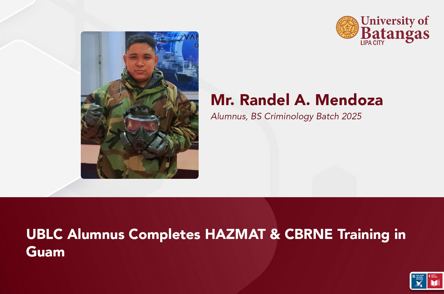 The University of Batangas Lipa City (UBLC) proudly congratulates Mr. Randel A. Mendoza, a graduate of the College of Criminal Justice Education, for successfully completing the State Partnership Program (SPP) Basic Operations for HAZMAT & CBRNE (Chemical, Biological, Radiological, Nuclear Events) Management 2025. The training was conducted by the U.S. Military Guam National Guard.