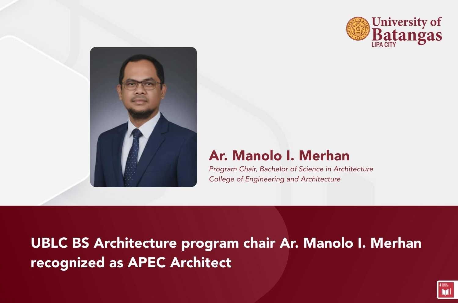 Ar. Manolo I. Merhan, a distinguished architect and Program Chair of the Bachelor of Science in Architecture of the University of Batangas Lipa City (UBLC), has successfully passed the Professional Panel of Experts Interview conducted by the Asia-Pacific Economic Cooperation (APEC) Architect Monitoring Committee, with the official results released on November 25, 2025, formally recognizing him as an APEC Architect.