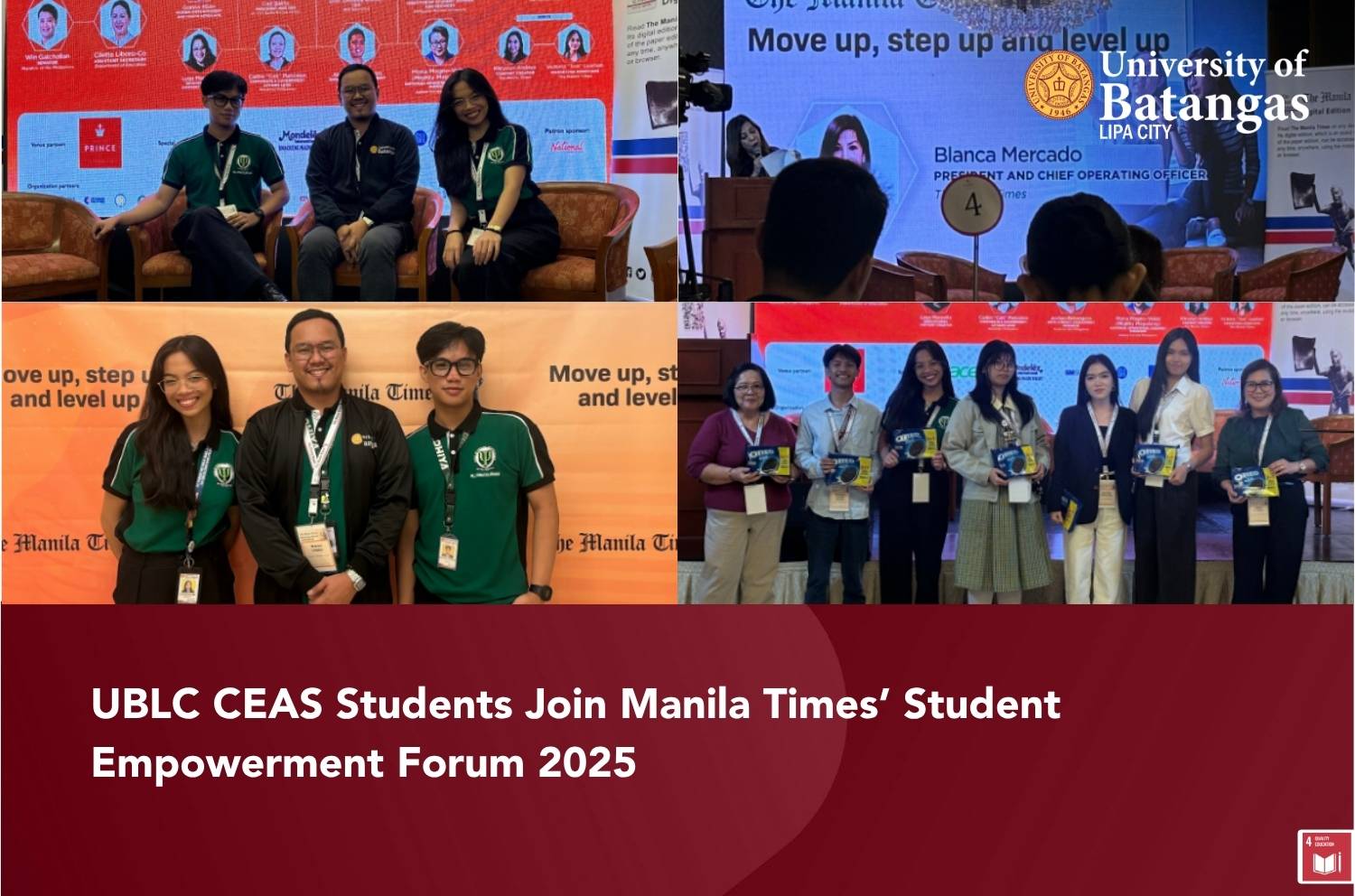 Students from the College of Education, Arts, and Sciences (CEAS) of the University of Batangas Lipa City (UBLC) participated in the Student Empowerment Forum 2025, organized by The Manila Times on August 22, 2025, at the Manila Prince Hotel. The event, themed “Move Up, Step Up, and Level Up,” aimed to equip Filipino youth with global competencies, practical skills, and values essential for navigating today’s world.