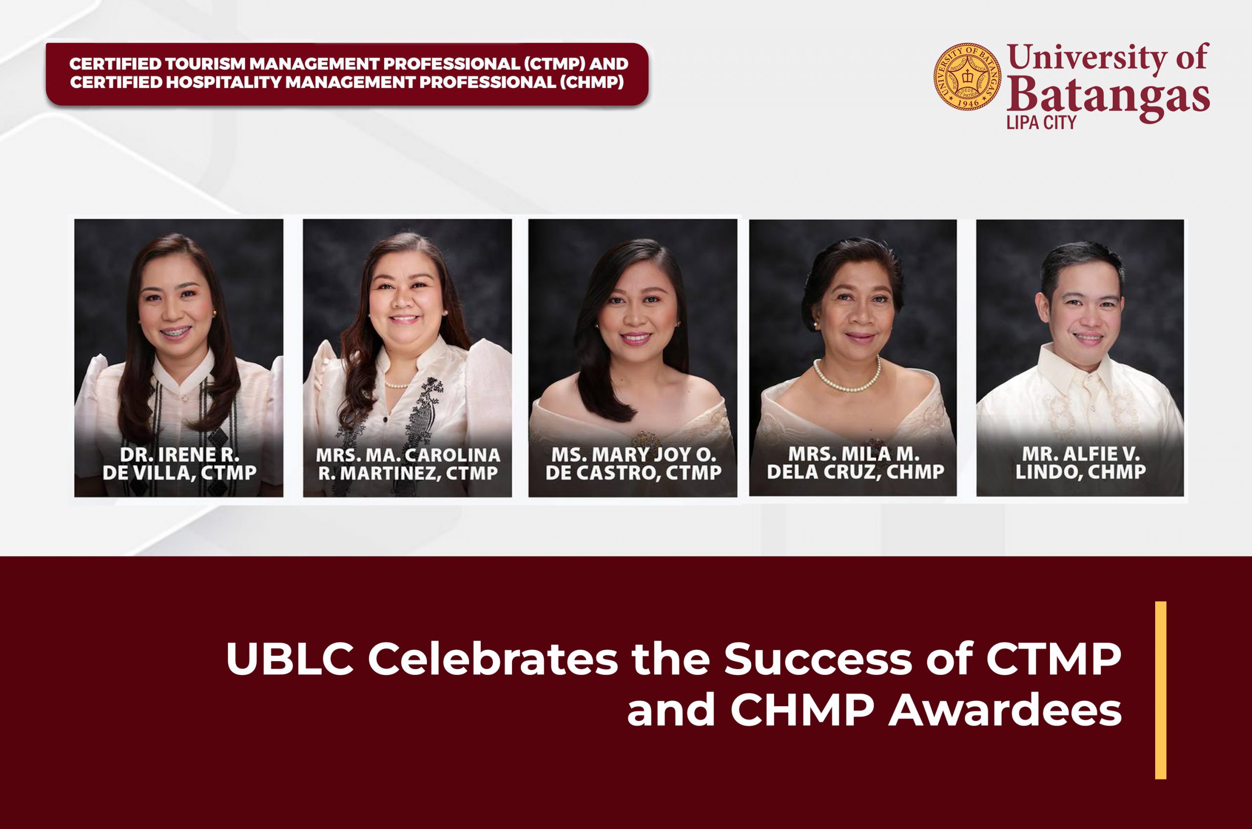 The University of Batangas Lipa City takes immense pride in congratulating our Certified Tourism Management Professionals (CTMP) and Certified Hospitality Management Professionals (CHMP). This remarkable achievement is led by the esteemed Dean of the College of Management and Tourism (CMT), Dr. Irene R. Devilla, together with the exceptional faculty members: Mrs. Ma. Carolina R. Martinez, Ms. Mary Joy O. De Castro, Mrs. Mila M. Dela Cruz, and Mr. Alfie V. Lindo.
