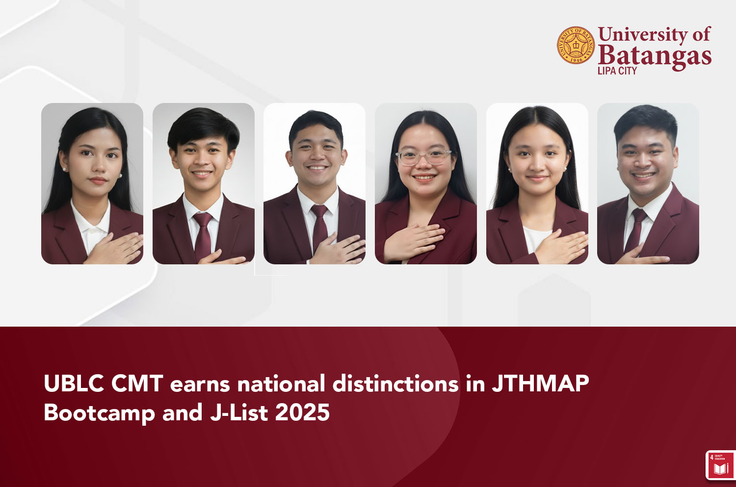 UP Diliman, Quezon City – October 15, 2025. The University of Batangas Lipa City (UBLC) once again showcased its commitment to excellence and leadership as students from the College of Management and Tourism (CMT) emerged as finalists and national representatives in the JTHMAP Bootcamp and J-List 2025, a two-day national event hosted by the Junior Tourism and Hospitality Management Association of the Philippines (JTHMAP) at the Student Union Building, University of the Philippines – Diliman.