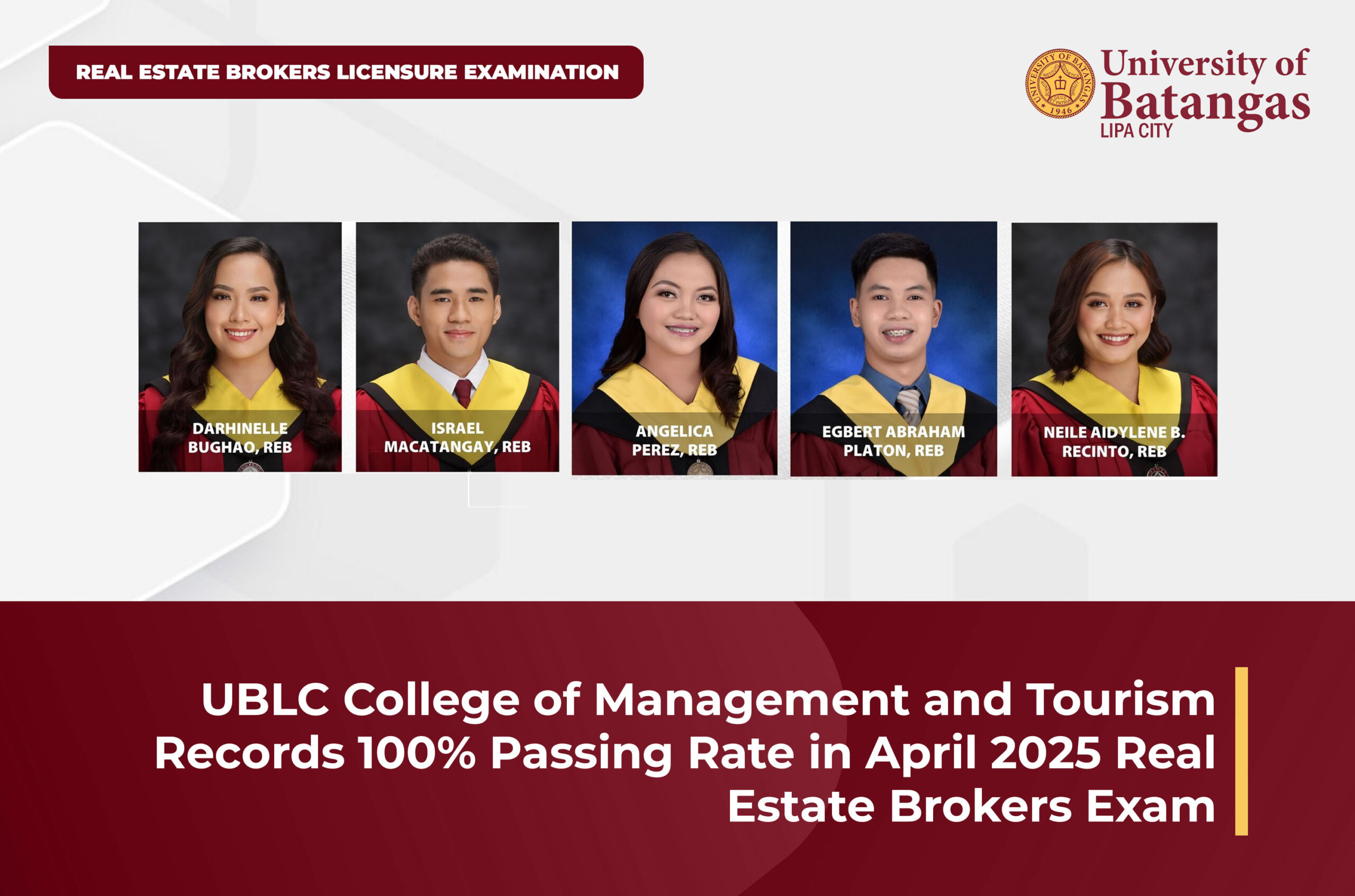 Graduates of the University of Batangas Lipa Campus (UBLC) College of Management and Tourism achieved a 100% passing rate among first-time takers in the April 2025 Real Estate Brokers Licensure Examination, according to recently released results.